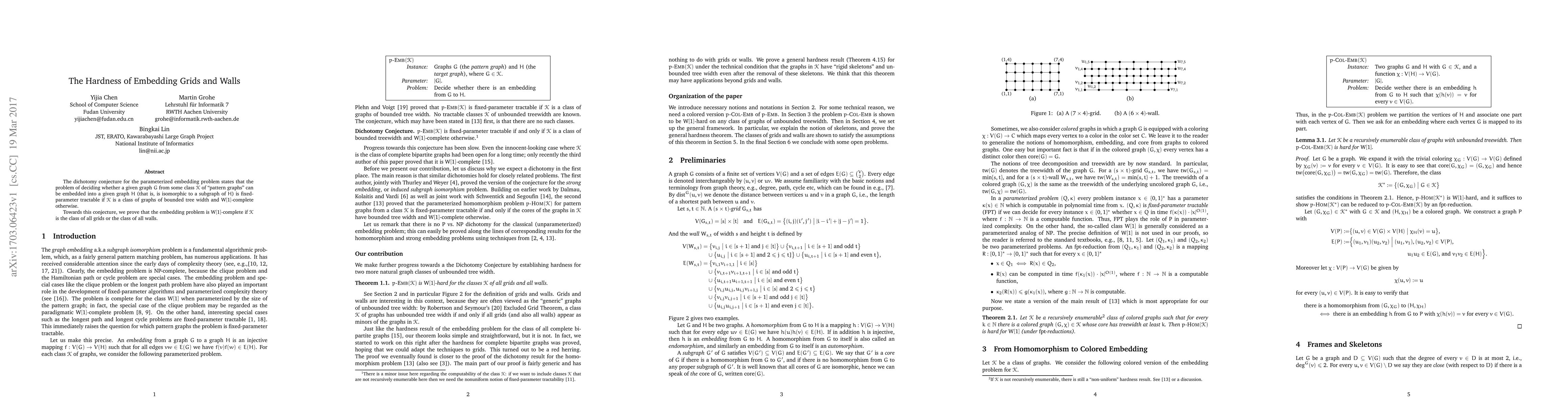 The dichotomy conjecture for the parameterized embedding problem states that the problem of deciding whether a given graph $G$ from some class $K$ of "pattern graphs" can be embedded into a given graph $H$ (that is, is isomorphic to a subgraph of $H$) is fixed-parameter tractable if $K$ is a class of graphs of bounded tree width and $W[1]$-complete otherwise. Towards this conjecture, we prove that the embedding problem is $W[1]$-complete if $K$ is the class of all grids or the class of all walls.