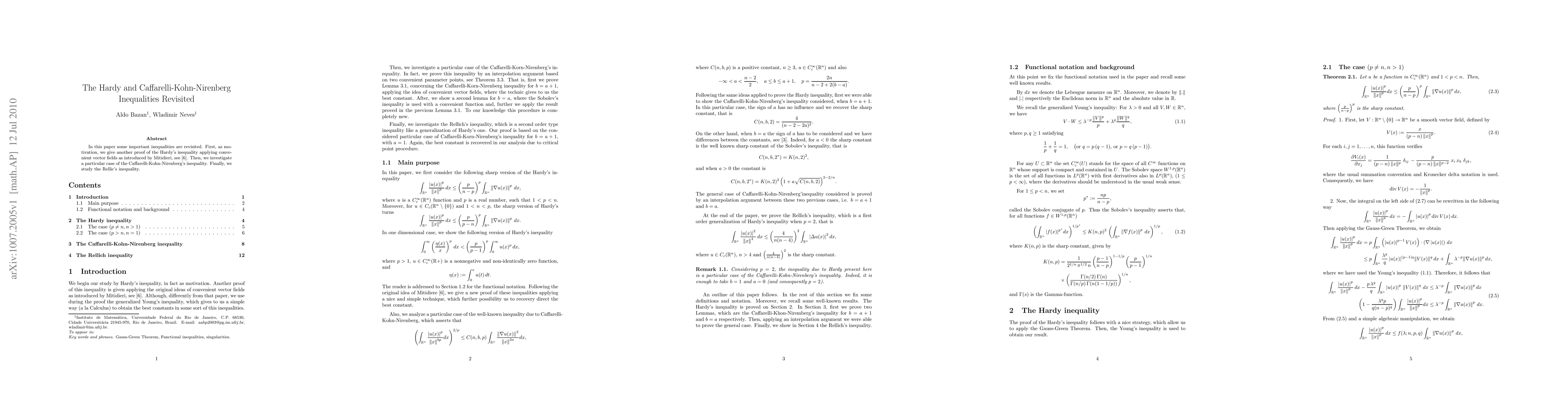 This paper provides an alternative proof of the Hardy inequality using Mitidieri's vector fields and explores a specific case of the Caffarelli-Kohn-Nirenberg inequality, along with a study of Rellic's inequality.