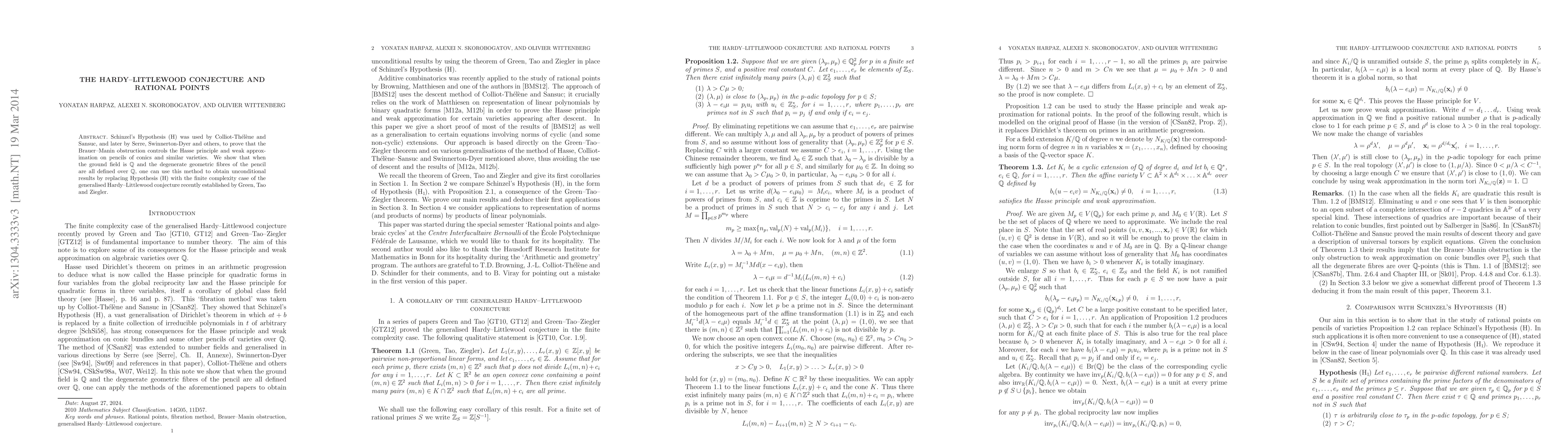 Schinzel's Hypothesis (H) was used by Colliot-Th\'el\`ene and Sansuc, and later by Serre, Swinnerton-Dyer and others, to prove that the Brauer-Manin obstruction controls the Hasse principle and weak approximation on pencils of conics and similar varieties. We show that when the ground field is Q and the degenerate geometric fibres of the pencil are all defined over Q, one can use these methods to obtain unconditional results by replacing Hypothesis (H) with the finite complexity case of the generalised Hardy-Littlewood conjecture recently established by Green, Tao and Ziegler.