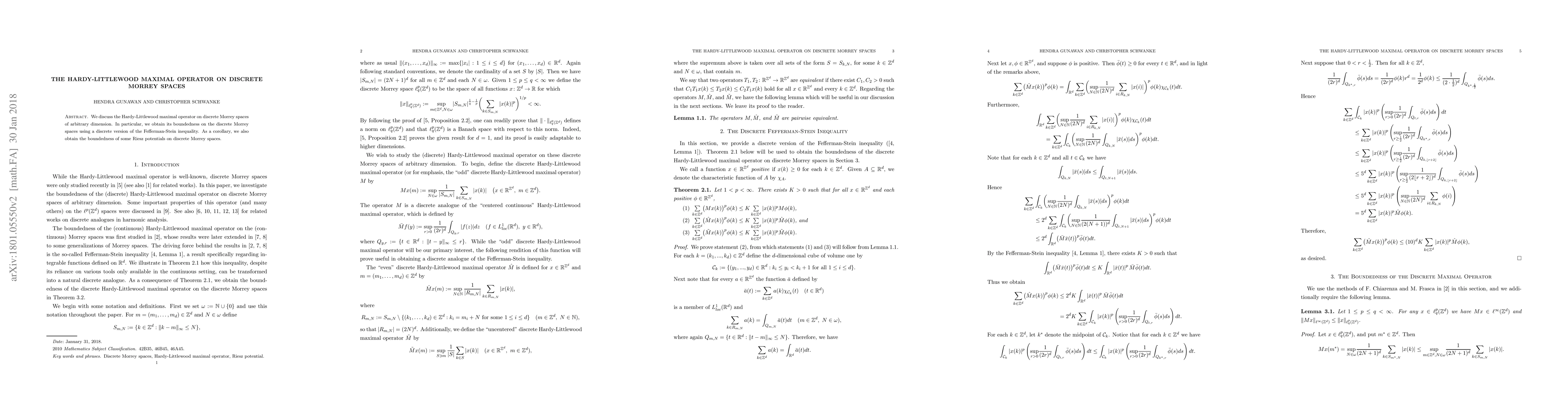 The paper investigates the boundedness of the Hardy-Littlewood maximal operator on discrete Morrey spaces and demonstrates its boundedness using a discrete version of the Fefferman-Stein inequality, with a corollary on the boundedness of certain Riesz potentials.