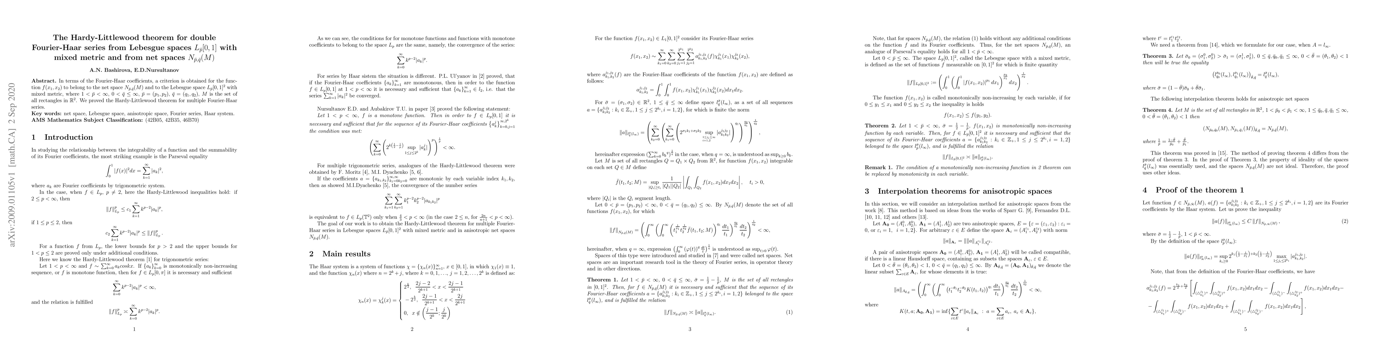 In terms of the Fourier-Haar coefficients, a criterion is obtained for the function $f (x_1,x_2)$ to belong to the net space $N_{\bar{p},\bar{q}}(M)$ and to the Lebesgue space $L_{\bar{p}}[0,1]^2$ with mixed metric, where $1<\bar{p}<\infty$, $0<\bar{q}\leq\infty$, $\bar{p}=(p_1,p_2)$, $\bar{q}=(q_1,q_2)$, $M$ is the set of all rectangles in $\mathbb{R}^2$. We proved the Hardy-Littlewood theorem for multiple Fourier-Haar series.