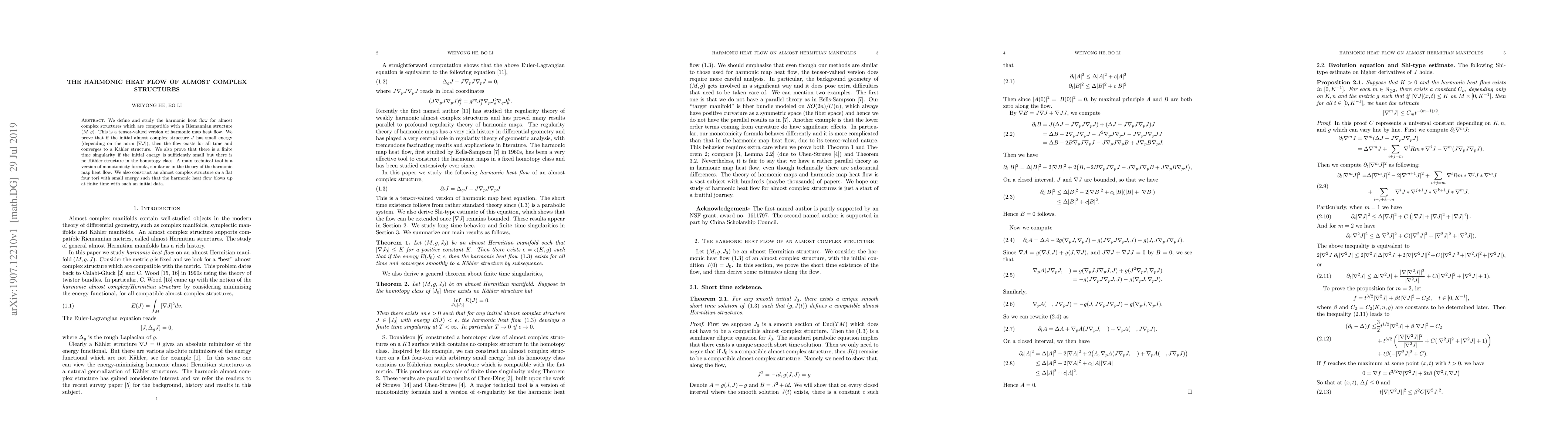 This paper explores the harmonic heat flow for almost complex structures compatible with a Riemannian manifold, proving that small initial energy leads to convergence to a Kähler structure while finite time singularities occur if no Kähler structure exists in the homotopy class. The study employs a monotonicity formula and constructs an example on a flat four torus where the flow blows up.