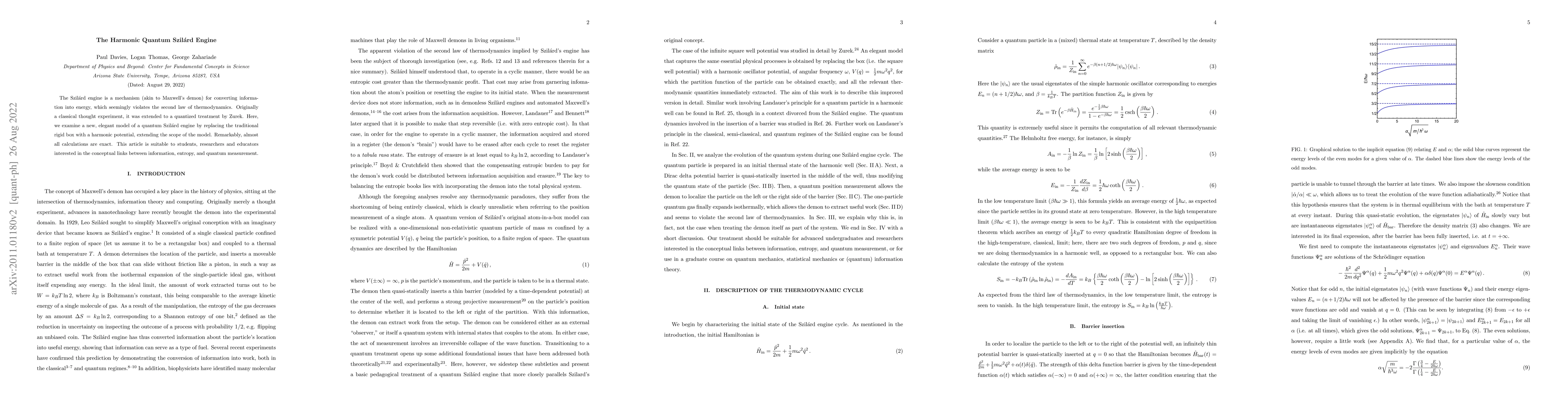 This paper presents a harmonic quantum version of the Szil\'ard engine, a thought experiment converting information into energy, with exact calculations replacing the classical rigid box with a harmonic potential. It explores the conceptual connections between information, entropy, and quantum measurement.