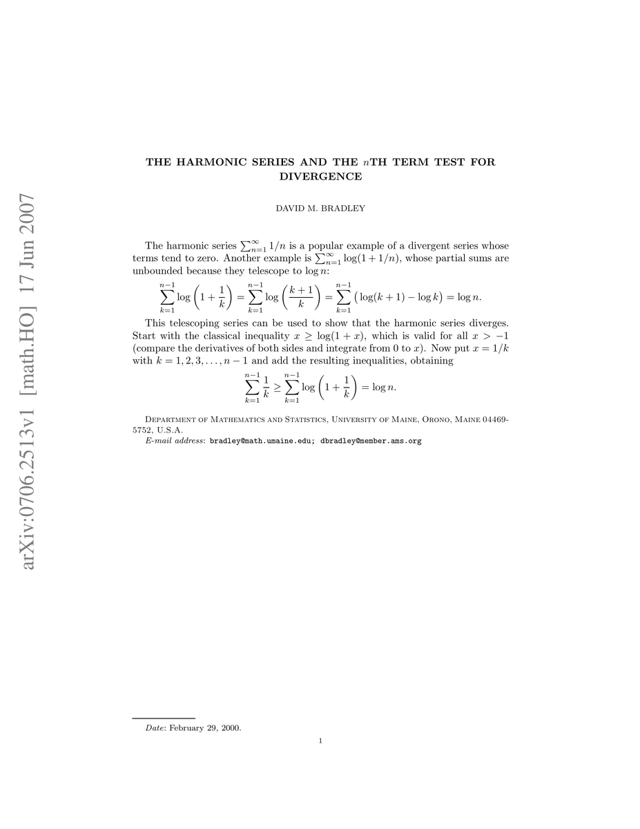 Summary: The paper proves the divergence of the harmonic series by comparing it to a series that telescopes to the natural logarithm, leveraging the inequality x ≥ log(1+x) for x=1/k and summing over k. This comparison demonstrates the harmonic series' divergence.