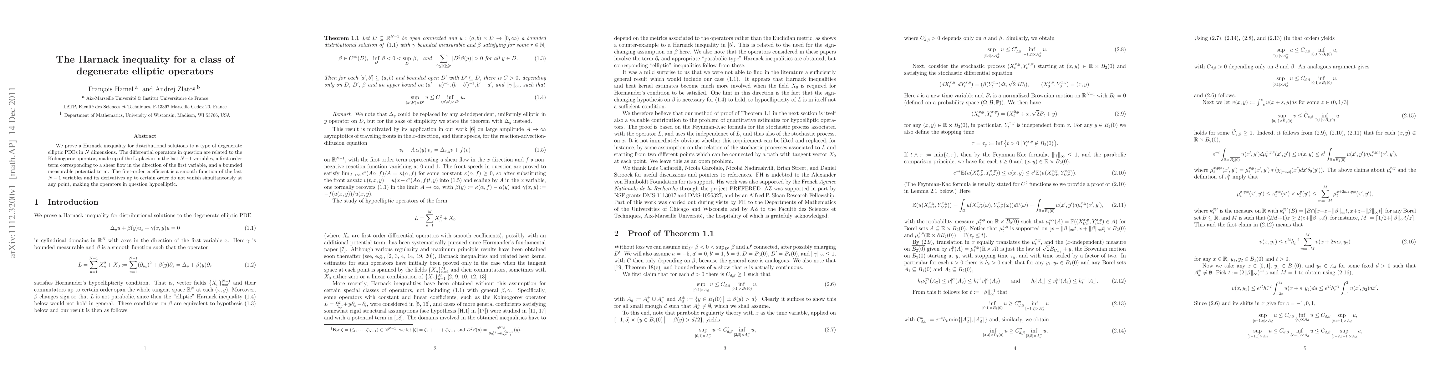 We prove a Harnack inequality for distributional solutions to a type of degenerate elliptic PDEs in $N$ dimensions. The differential operators in question are related to the Kolmogorov operator, made up of the Laplacian in the last $N-1$ variables, a first-order term corresponding to a shear flow in the direction of the first variable, and a bounded measurable potential term. The first-order coefficient is a smooth function of the last $N-1$ variables and its derivatives up to certain order do not vanish simultaneously at any point, making the operators in question hypoelliptic.