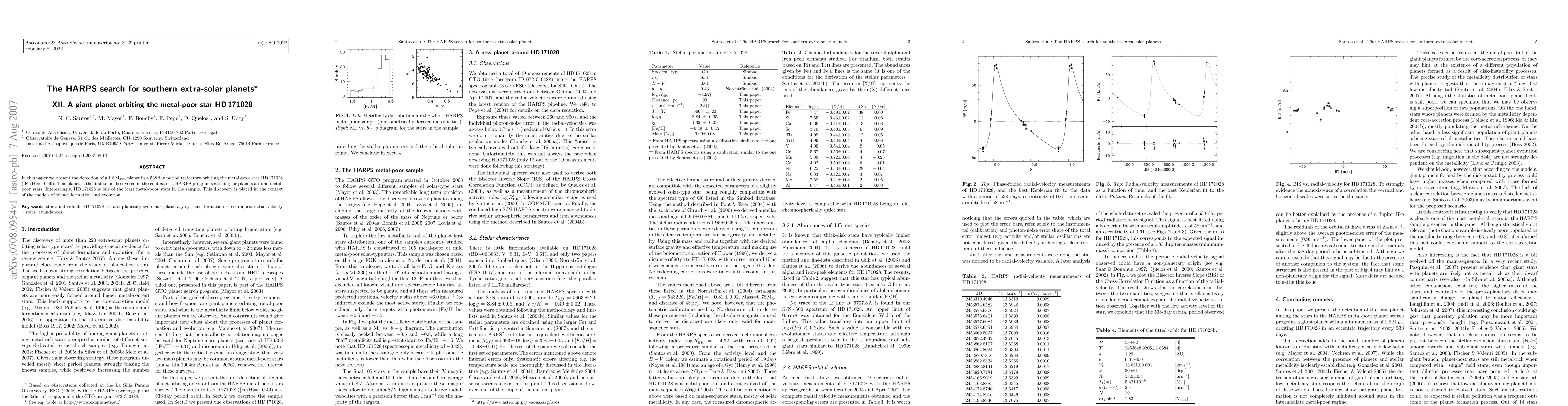 Summary: The paper reports the detection of a 1.8 M_Jup giant planet orbiting the metal-poor star HD171028 in a 538-day orbit, marking the first planet discovered in the HARPS program targeting metal-poor stars. This finding contributes to models of planet formation and evolution.
