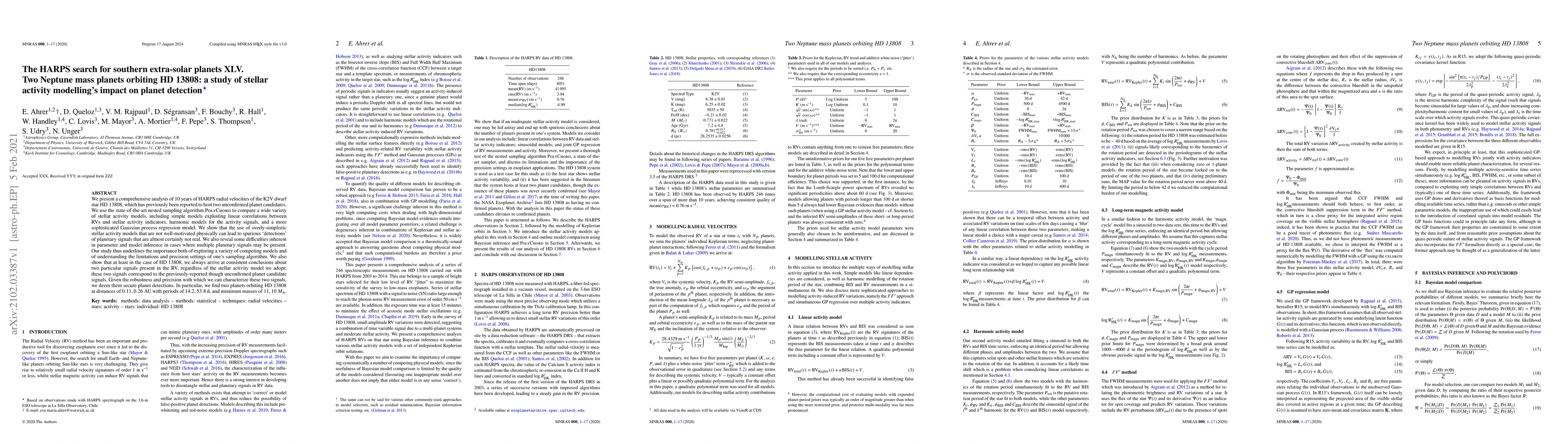 This paper analyzes 10 years of HARPS radial velocity data for HD 13808, confirming the presence of two Neptune-mass planets at distances of 0.11 and 0.26 AU. It emphasizes the importance of sophisticated stellar activity models to avoid false planet detections and highlights the robustness of the findings despite the complexity of model inference.