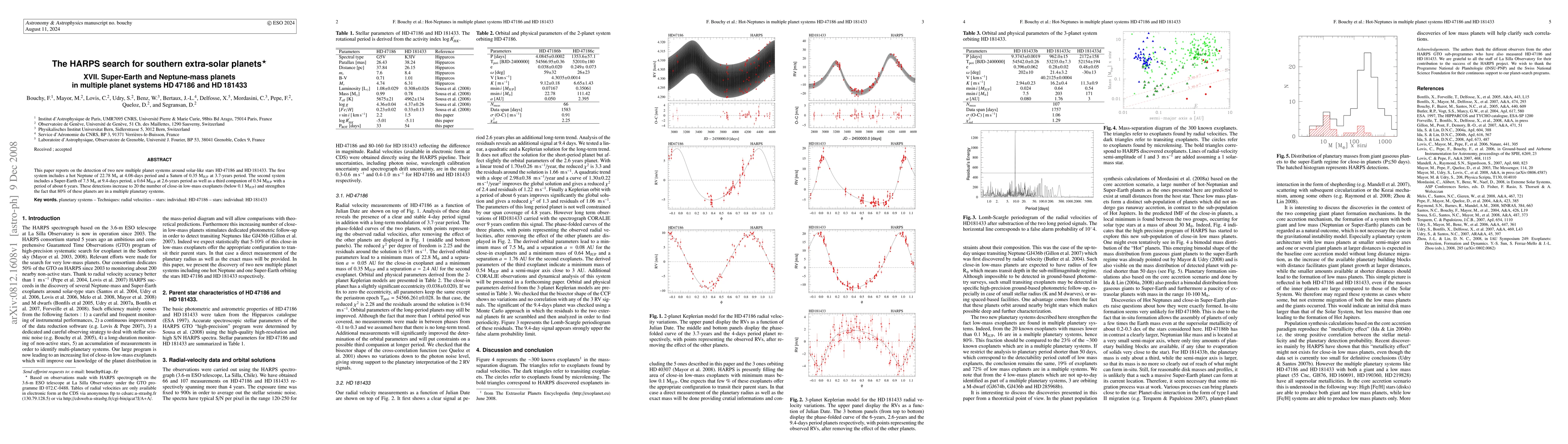 This paper reports the discovery of two new multiple planet systems around stars HD47186 and HD181433, including a hot Neptune and a Saturn-mass planet, and a Super-Earth along with two gas giants, enhancing the understanding of low-mass exoplanets in multiple systems.