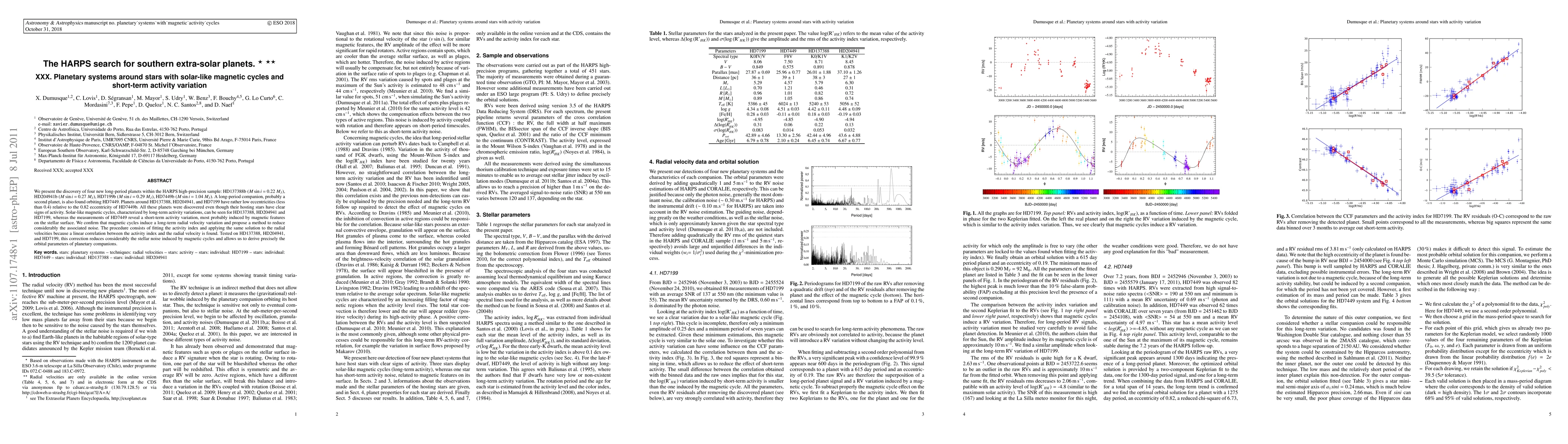 The HARPS survey discovered four long-period planets around stars with solar-like magnetic cycles and varying activity levels. A method to reduce noise from stellar activity was developed, enabling precise determination of planetary parameters despite the stars' activity.