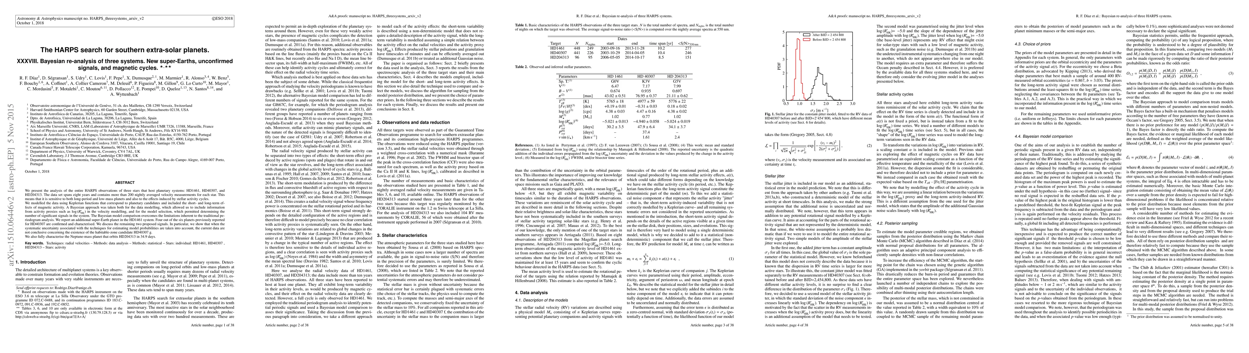 We present the analysis of the entire HARPS observations of three stars that host planetary systems: HD1461, HD40307, and HD204313. The data set spans eight years and contains more than 200 nightly averaged velocity measurements for each star. This means that it is sensitive to both long-period and low-mass planets and also to the effects induced by stellar activity cycles. We modelled the data using Keplerian functions that correspond to planetary candidates and included the short- and long-term effects of magnetic activity. A Bayesian approach was taken both for the data modelling, which allowed us to include information from activity proxies such as $\log{(R'_{\rm HK})}$ in the velocity modelling, and for the model selection, which permitted determining the number of significant signals in the system. The Bayesian model comparison overcomes the limitations inherent to the traditional periodogram analysis. We report an additional super-Earth planet in the HD1461 system. Four out of the six planets previously reported for HD40307 are confirmed and characterised. We discuss the remaining two proposed signals. In particular, we show that when the systematic uncertainty associated with the techniques for estimating model probabilities are taken into account, the current data are not conclusive concerning the existence of the habitable-zone candidate HD40307 g. We also fully characterise the Neptune-mass planet that orbits HD204313 in 34.9 days.