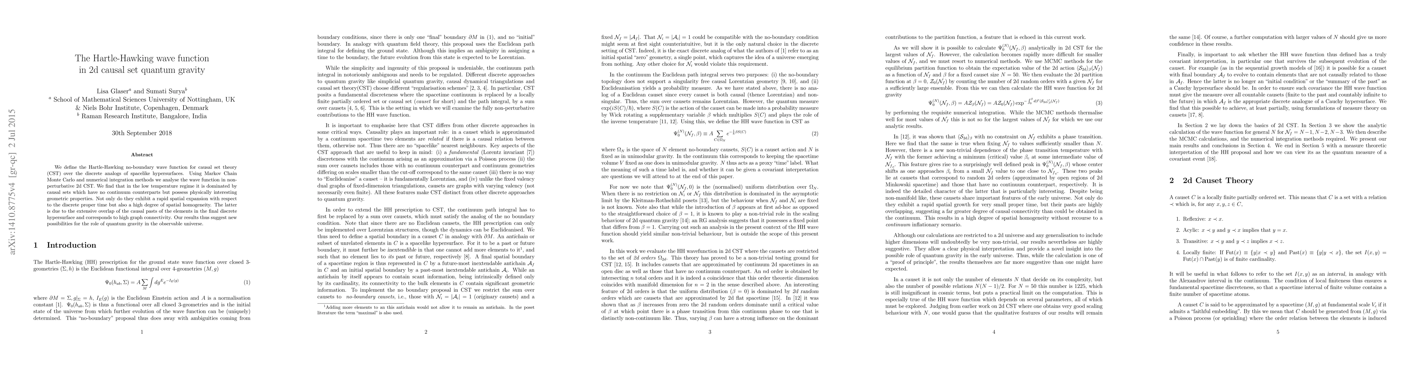 This paper defines the Hartle-Hawking no-boundary wave function for 2d causal set theory and uses numerical methods to analyze it. It finds that low-temperature regimes favor causal sets with unique geometric properties, including rapid spatial expansion and high homogeneity due to extensive graph connectivity.