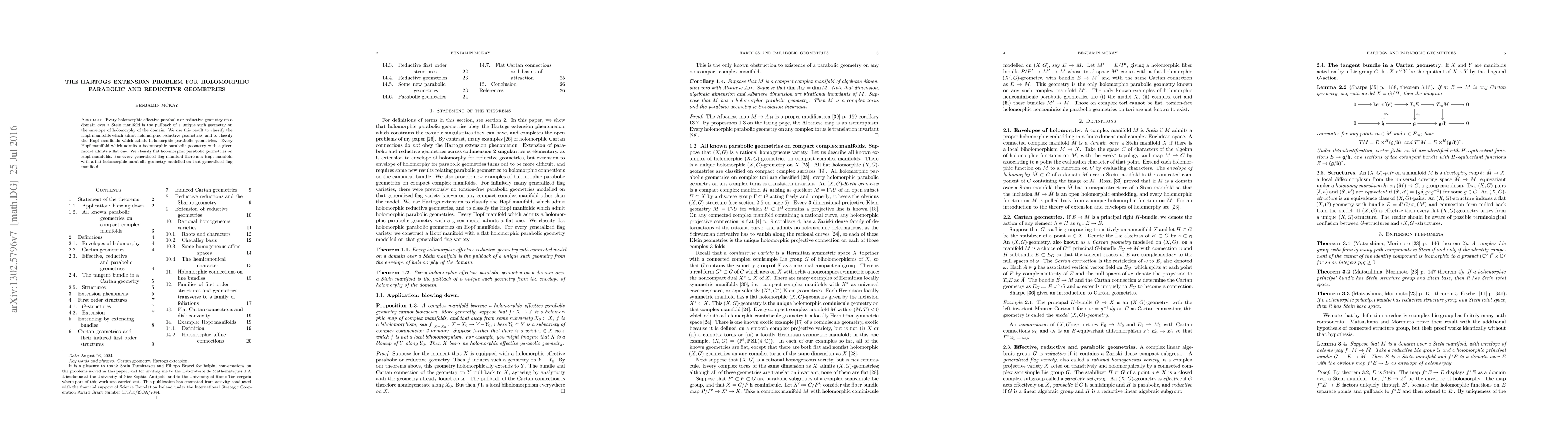 The paper establishes a unique extension of holomorphic parabolic and reductive geometries from Stein manifolds to their envelopes of holomorphy, providing insights into Hopf manifolds admitting these structures.