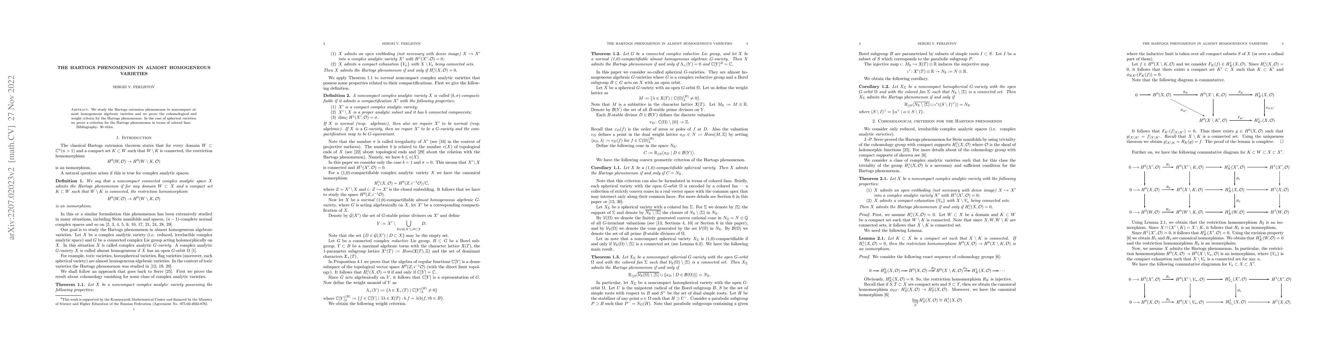 This paper investigates the Hartogs extension phenomenon in noncompact almost homogeneous algebraic varieties, establishing cohomological and weight criteria for this phenomenon. For spherical varieties, it provides a criterion based on colored fans.
