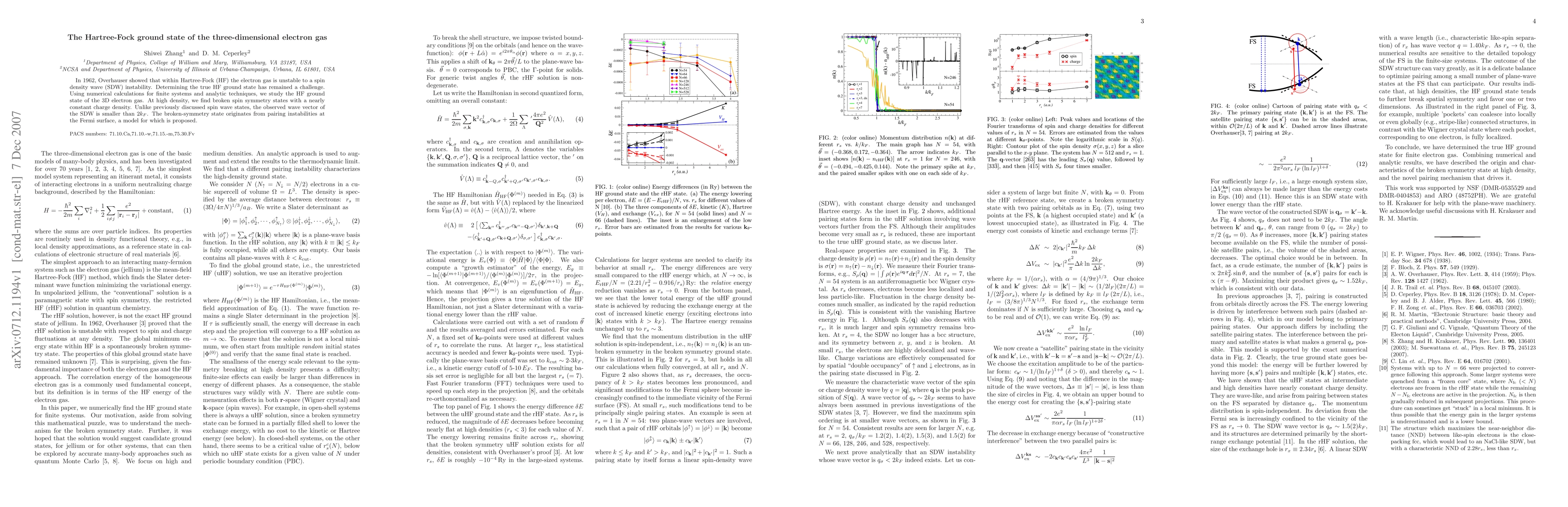 This paper investigates the Hartree-Fock ground state of the three-dimensional electron gas, revealing that at high density, it exhibits broken spin symmetry with a spin density wave (SDW) having a wave vector smaller than $2 k_F$. The study proposes a model for pairing instabilities at the Fermi surface as the origin of this behavior.