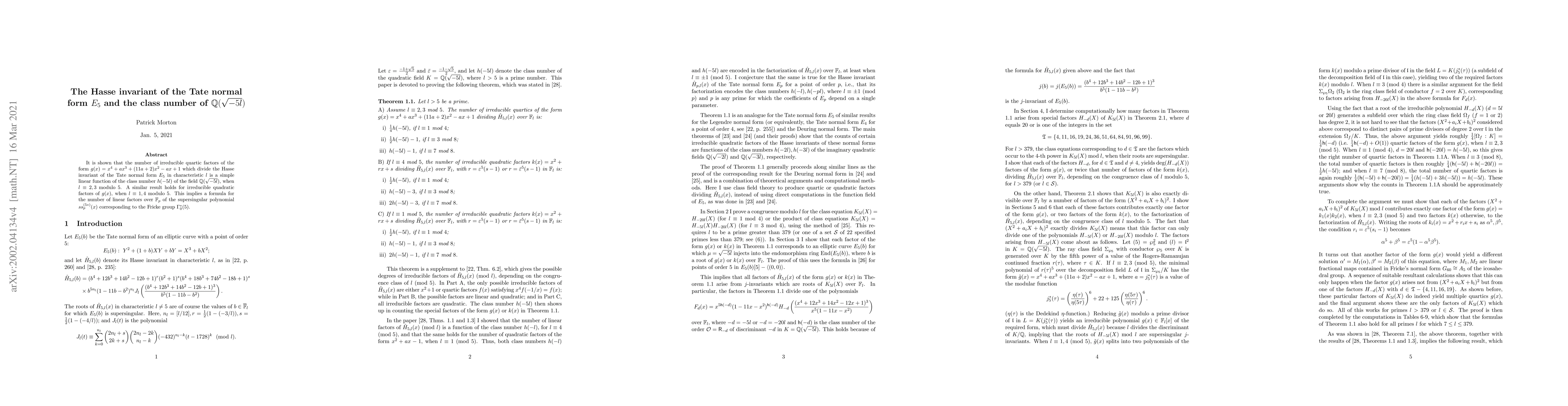 It is shown that the number of irreducible quartic factors of the form $g(x) = x^4+ax^3+(11a+2)x^2-ax+1$ which divide the Hasse invariant of the Tate normal form $E_5$ in characteristic $l$ is a simple linear function of the class number $h(-5l)$ of the field $\mathbb{Q}(\sqrt{-5l})$, when $l \equiv 2,3$ modulo $5$. A similar result holds for irreducible quadratic factors of $g(x)$, when $l \equiv 1, 4$ modulo $5$. This implies a formula for the number of linear factors over $\mathbb{F}_p$ of the supersingular polynomial $ss_p^{(5*)}(x)$ corresponding to the Fricke group $\Gamma_0^*(5)$.