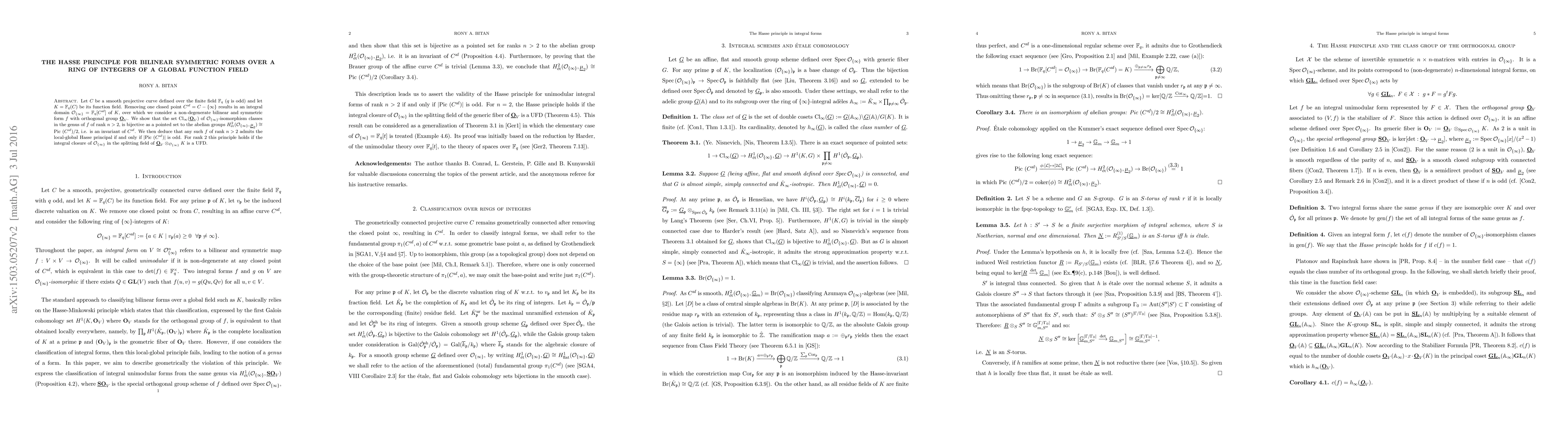 Let $C$ be a smooth projective curve defined over the finite field $\mathbb{F}_q$ ($q$ is odd) and let $K=\mathbb{F}_q(C)$ be its function field. Removing one closed point $C^\text{af} = C-\{\infty\}$ results in an integral domain $\mathcal{O}_{\{\infty\}} = \mathbb{F}_q[C^\text{af}]$ of $K$, over which we consider a non-degenerate bilinear and symmetric form $f$ with orthogonal group $\underline{\textbf{O}}_V$. We show that the set $\text{Cl}_\infty(\underline{\textbf{O}}_V)$ of $\mathcal{O}_{\{\infty\}}$-isomorphism classes in the genus of $f$ of rank $n>2$, is bijective as a pointed set to the abelian groups $H^2_{\text{\'et}}(\mathcal{O}_{\{\infty\}},\underline{\mu}_2) \cong \text{Pic}(C^\text{af})/2$, i.e. is an invariant of $C^\text{af}$. We then deduce that any such $f$ of rank $n>2$ admits the local-global Hasse principal if and only if $|\text{Pic}(C^\text{af})|$ is odd. For rank $2$ this principle holds if the integral closure of $\mathcal{O}_{\{\infty\}}$ in the splitting field of $\underline{\textbf{O}}_V \otimes_{\mathcal{O}_{\{\infty\}}} K$ is a UFD.