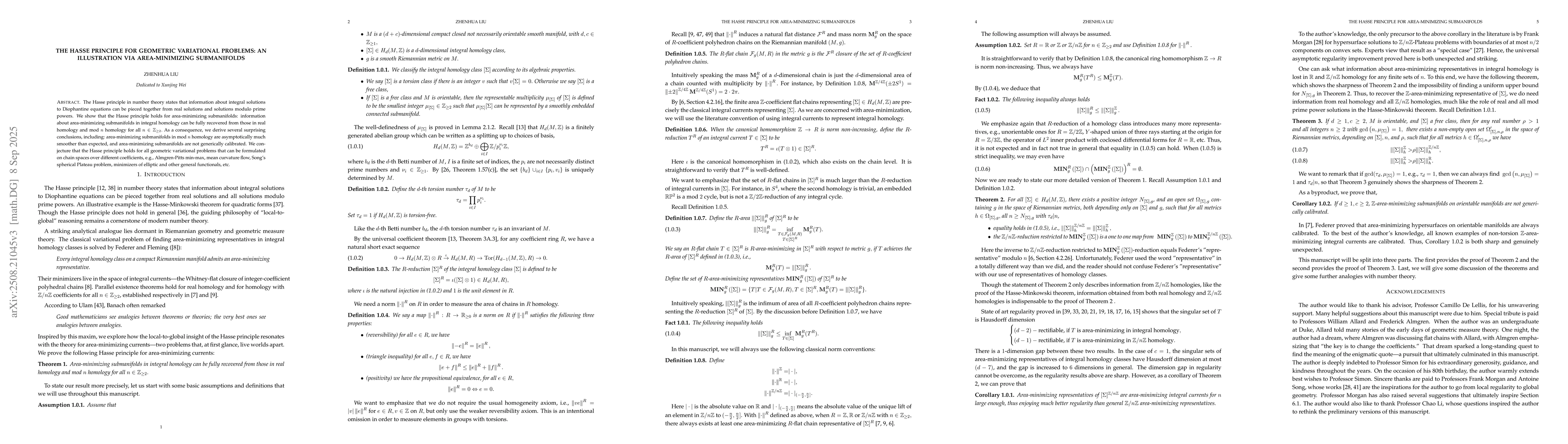 The Hasse principle in number theory states that information about integral solutions to Diophantine equations can be pieced together from real solutions and solutions modulo prime powers. We show that the Hasse principle holds for area-minimizing submanifolds: information about area-minimizing submanifolds in integral homology can be fully recovered from those in real homology and mod $n$ homology for all $n\in \mathbb{Z}_{\ge 2}.$ As a consequence we derive several surprising conclusions, including: area-minimizing submanifolds in mod $n$ homology are asymptotically much smoother than expected and area-minimizing submanifolds are not generically calibrated. We conjecture that the Hasse principle holds for all geometric variational problems that can be formulated on chain space over different coeffiicients, e.g., Almgren-Pitts min-max, mean curvature flow, Song's spherical Plateau problem, minimizers of elliptic and other general functionals, etc.