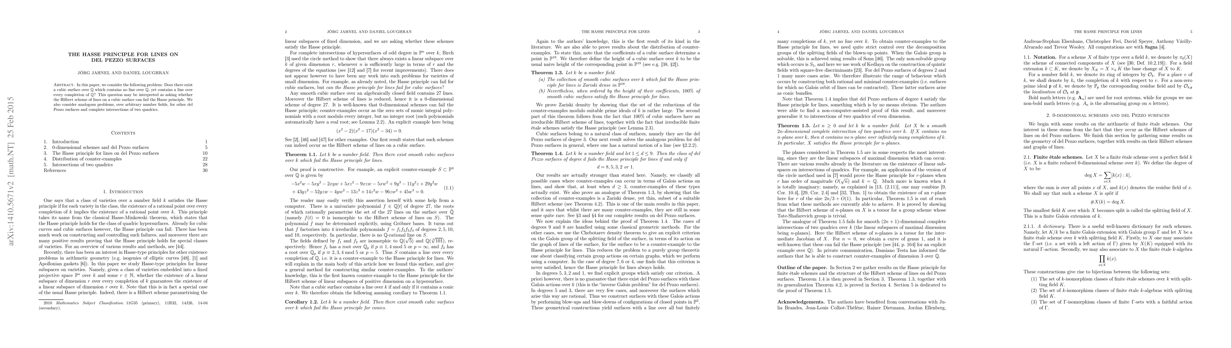Summary: The paper investigates whether cubic surfaces over $\mathbb{Q}$ can exist without rational lines but with lines over all completions of $\mathbb{Q}$, exploring the failure of the Hasse principle in the context of lines on del Pezzo surfaces and complete intersections of two quadrics over various number fields.