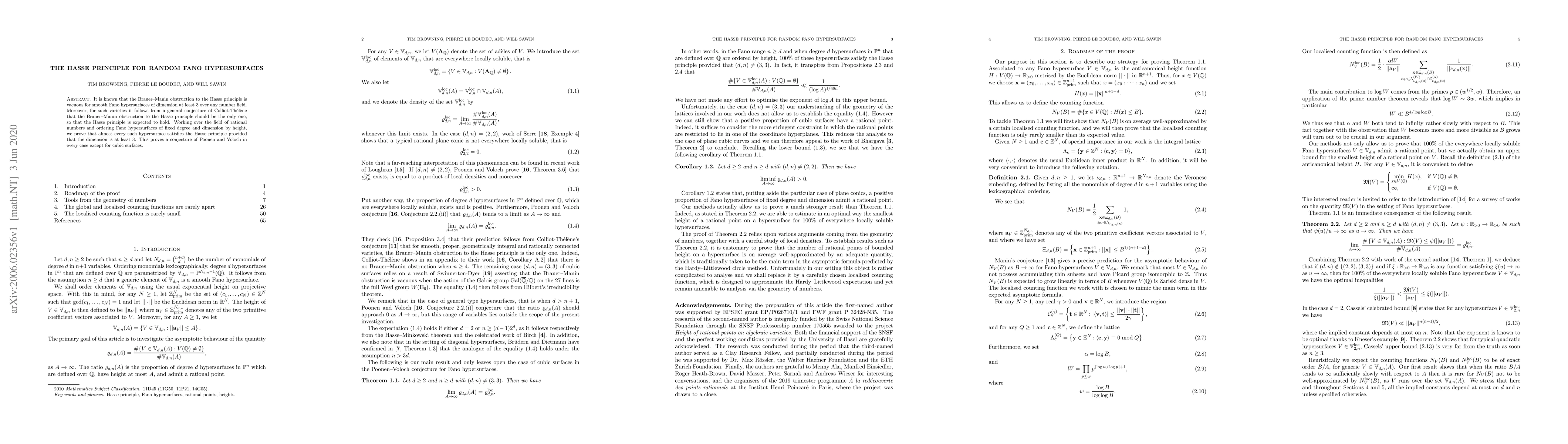 The paper proves that almost every random Fano hypersurface of dimension at least 3 over the rational numbers satisfies the Hasse principle, validating a conjecture by Poonen and Voloch, except for cubic surfaces. The Brauer-Manin obstruction is identified as the sole obstruction for these higher-dimensional Fano varieties.