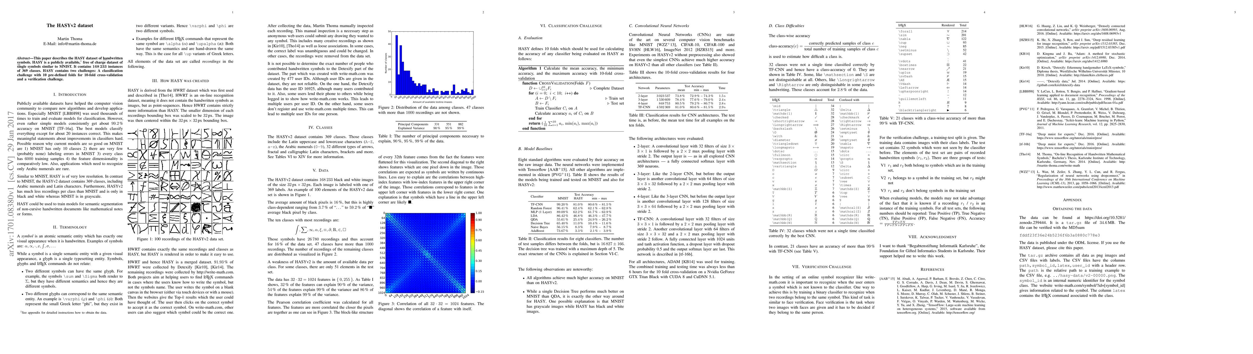 The HASYv2 dataset offers 168,233 instances of 369 symbol classes, similar to MNIST, with a classification challenge and a verification challenge, including 10-fold cross-validation. It is freely available for public use.
