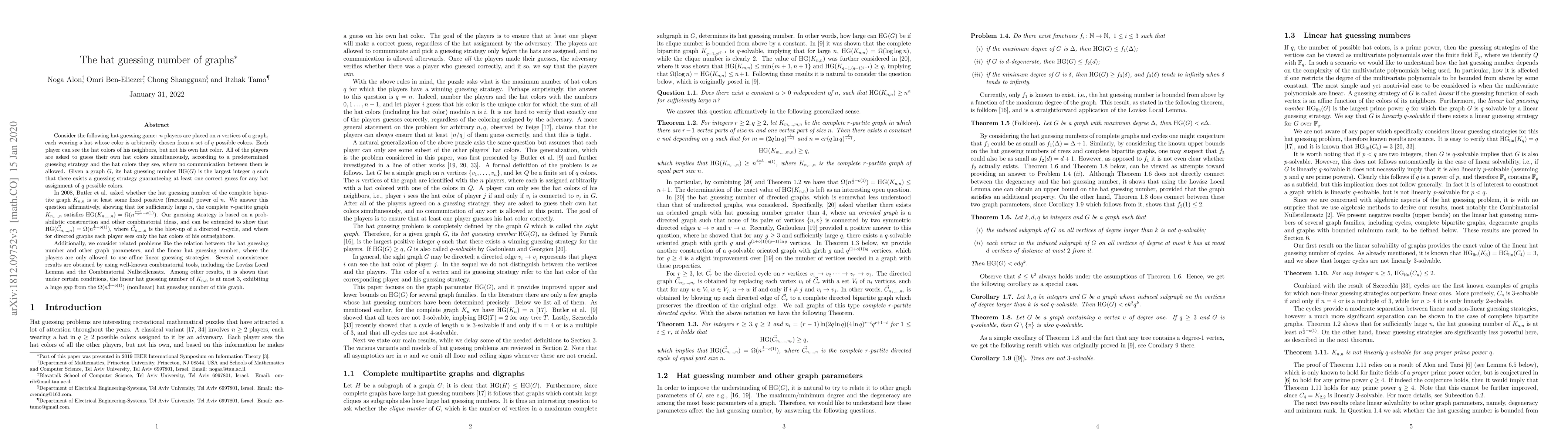 Consider the following hat guessing game: $n$ players are placed on $n$ vertices of a graph, each wearing a hat whose color is arbitrarily chosen from a set of $q$ possible colors. Each player can see the hat colors of his neighbors, but not his own hat color. All of the players are asked to guess their own hat colors simultaneously, according to a predetermined guessing strategy and the hat colors they see, where no communication between them is allowed. Given a graph $G$, its hat guessing number ${\rm{HG}}(G)$ is the largest integer $q$ such that there exists a guessing strategy guaranteeing at least one correct guess for any hat assignment of $q$ possible colors. In 2008, Butler et al. asked whether the hat guessing number of the complete bipartite graph $K_{n,n}$ is at least some fixed positive (fractional) power of $n$. We answer this question affirmatively, showing that for sufficiently large $n$, the complete $r$-partite graph $K_{n,\ldots,n}$ satisfies ${\rm{HG}}(K_{n,\ldots,n})=\Omega(n^{\frac{r-1}{r}-o(1)})$. Our guessing strategy is based on a probabilistic construction and other combinatorial ideas, and can be extended to show that ${\rm{HG}}(\vec{C}_{n,\ldots,n})=\Omega(n^{\frac{1}{r}-o(1)})$, where $\vec{C}_{n,\ldots,n}$ is the blow-up of a directed $r$-cycle, and where for directed graphs each player sees only the hat colors of his outneighbors.