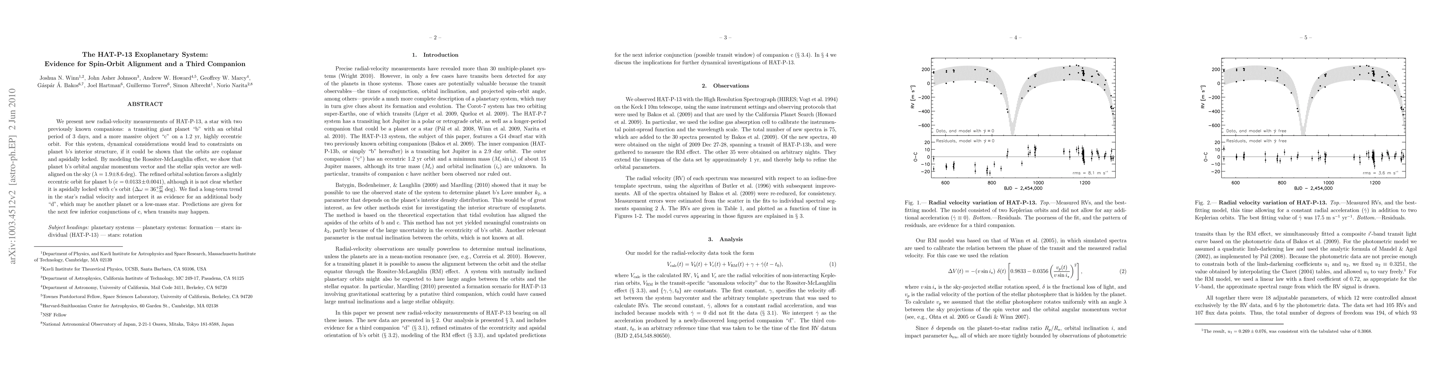 We present new radial-velocity measurements of HAT-P-13, a star with two previously known companions: a transiting giant planet "b" with an orbital period of 3 days, and a more massive object "c" on a 1.2 yr, highly eccentric orbit. For this system, dynamical considerations would lead to constraints on planet b's interior structure, if it could be shown that the orbits are coplanar and apsidally locked. By modeling the Rossiter-McLaughlin effect, we show that planet b's orbital angular momentum vector and the stellar spin vector are well-aligned on the sky (lambda = -0.9 +/- 8.5 deg), suggesting that the planetary orbits are also well-aligned. The refined orbital solution favors a slightly eccentric orbit for planet b (e = 0.0142_{-0.0044}^{+0.0052}), although it is not clear whether it is apsidally locked with c's orbit (\Delta\omega = 48_{-38}^{+25} deg). We find a long-term trend in the star's radial velocity and interpret it as evidence for an additional body "d", which may be another planet or a low-mass star. The next inferior conjunction of c, when a transit may happen, is expected on JD 2,455,315.2 +/- 1.9 (centered on UT 17h 2010 April 28).