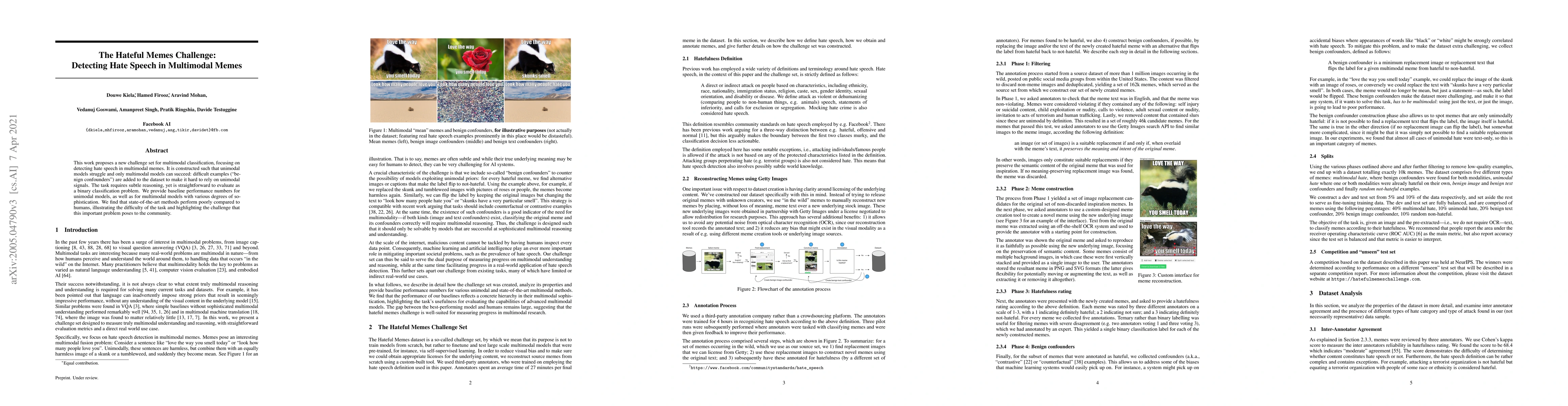 This work proposes a new challenge set for multimodal classification, focusing on detecting hate speech in multimodal memes. It is constructed such that unimodal models struggle and only multimodal models can succeed: difficult examples ("benign confounders") are added to the dataset to make it hard to rely on unimodal signals. The task requires subtle reasoning, yet is straightforward to evaluate as a binary classification problem. We provide baseline performance numbers for unimodal models, as well as for multimodal models with various degrees of sophistication. We find that state-of-the-art methods perform poorly compared to humans (64.73% vs. 84.7% accuracy), illustrating the difficulty of the task and highlighting the challenge that this important problem poses to the community.