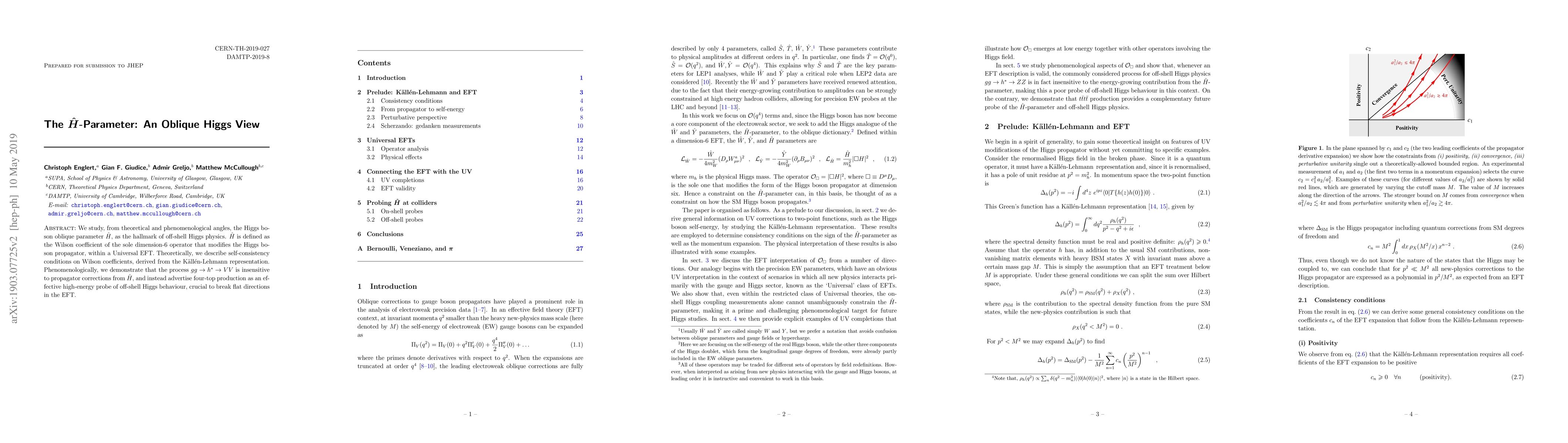 We study, from theoretical and phenomenological angles, the Higgs boson oblique parameter $\hat{H}$, as the hallmark of off-shell Higgs physics. $\hat{H}$ is defined as the Wilson coefficient of the sole dimension-6 operator that modifies the Higgs boson propagator, within a Universal EFT. Theoretically, we describe self-consistency conditions on Wilson coefficients, derived from the K\"{a}ll\'{e}n-Lehmann representation. Phenomenologically, we demonstrate that the process $gg\to h^\ast \to VV$ is insensitive to propagator corrections from $\hat{H}$, and instead advertise four-top production as an effective high-energy probe of off-shell Higgs behaviour, crucial to break flat directions in the EFT.