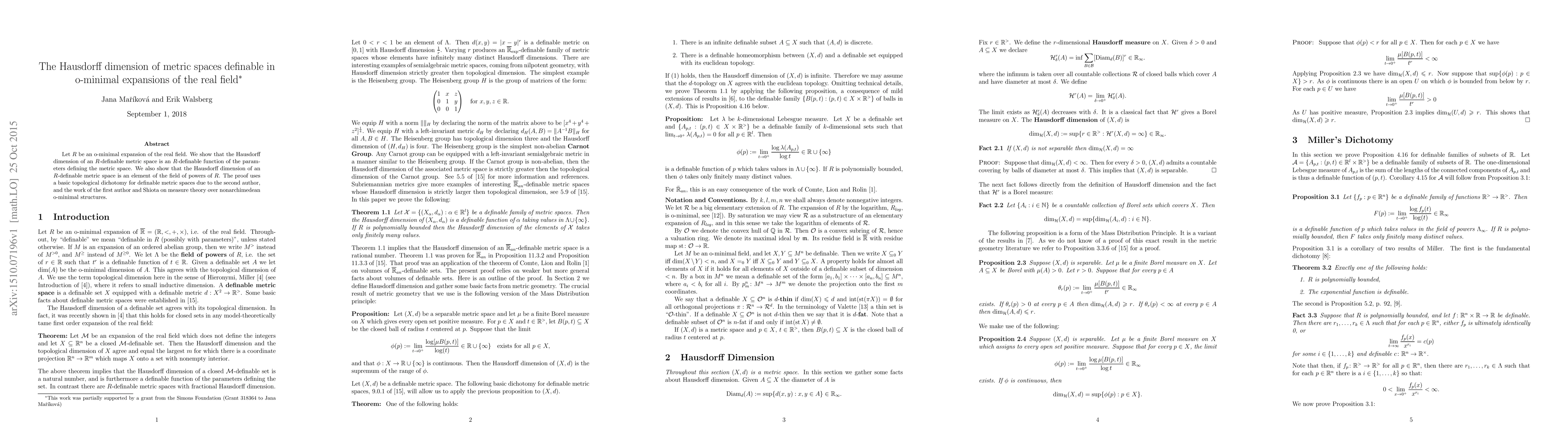 The paper introduces and proves a proposition regarding the definability and field-of-power-values nature of Hausdorff dimensions in o-minimal expansions of the real field.