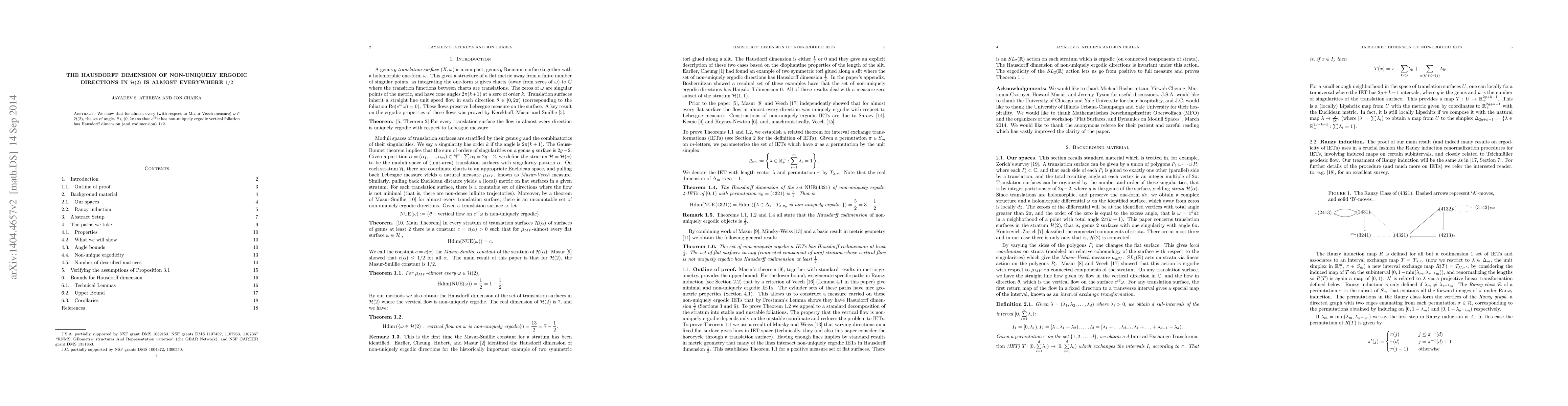 This paper demonstrates that for almost all $\omega$ in $\mathcal{H}(2)$ with respect to Masur-Veech measure, the angles $\theta$ leading to non-uniquely ergodic vertical foliations have a Hausdorff dimension of $1/2$. This result highlights the prevalent occurrence of $1/2$ dimension in these specific directions.