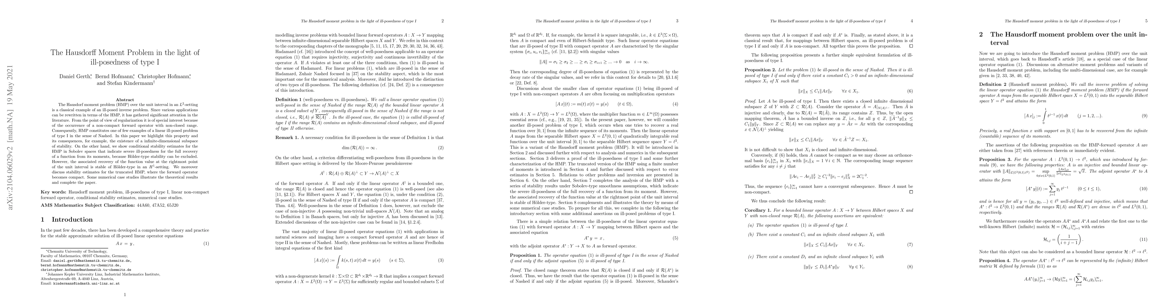 The Hausdorf moment problem (HMP) over the unit interval in an $L^2$-setting is a classical example of an ill-posed inverse problem. Since various applications can be rewritten in terms of the HMP, it has gathered significant attention in the literature. From the point of view of regularization it is of special interest because of the occurrence of a non-compact forward operator with non-closed range. Consequently, HMP constitutes one of few examples of a linear ill-posed problem of type~I in the sense of Nashed. In this paper we highlight this property and its consequences, for example, the existence of a infinite-dimensional subspace of stability. On the other hand, we show conditional stability estimates for the HMP in Sobolev spaces that indicate severe ill-posedness for the full recovery of a function from its moments, because H\"{o}lder-type stability can be excluded. However, the associated recovery %of the linear functional that characterizes of the function value at the rightmost point of the unit interval is stable of H\"{o}lder-type in an $H^1$-setting. We moreover discuss stability estimates for the truncated HMP, where the forward operator becomes compact. Some numerical case studies illustrate the theoretical results and complete the paper.