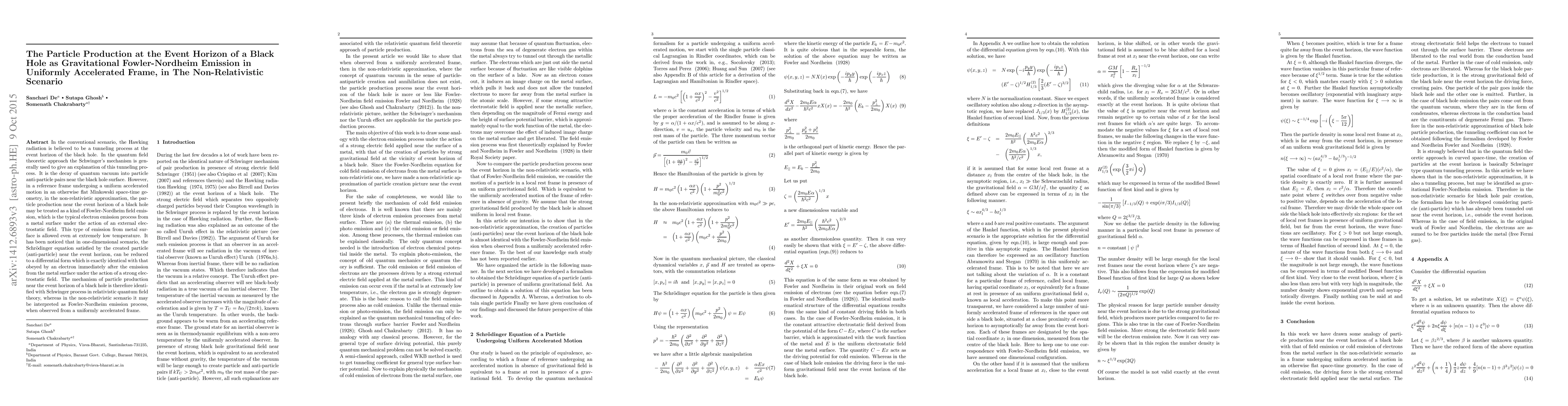 In the conventional scenario, the Hawking radiation is believed to be a tunneling process at the event horizon of the black hole. In the quantum field theoretic approach the Schwinger's mechanism is generally used to give an explanation of this tunneling process. It is the decay of quantum vacuum into particle anti-particle pairs near the black hole surface. However, in a reference frame undergoing an uniform accelerated motion in an otherwise flat Minkowski space-time geometry, in the non-relativistic approximation, the particle production near the event horizon of a black hole may be treated as a kind of Fowler-Nordheim field emission, which is the typical electron emission process from a metal surface under the action of an external electrostatic field. This type of emission from metal surface is allowed even at extremely low temperature. It has been noticed that in one-dimensional scenario, the Schr$\ddot{\rm{o}}$dinger equation satisfied by the created particle (anti-particle) near the event horizon, can be reduced to a differential form which is exactly identical with that obeyed by an electron immediately after the emission from the metal surface under the action of a strong electrostatic field. The mechanism of particle production near the event horizon of a black hole is therefore identified with Schwinger process in relativistic quantum field theory, whereas in the non-relativistic scenario it may be interpreted as Fowler-Nordheim emission process, when observed from an uniformly accelerated frame.