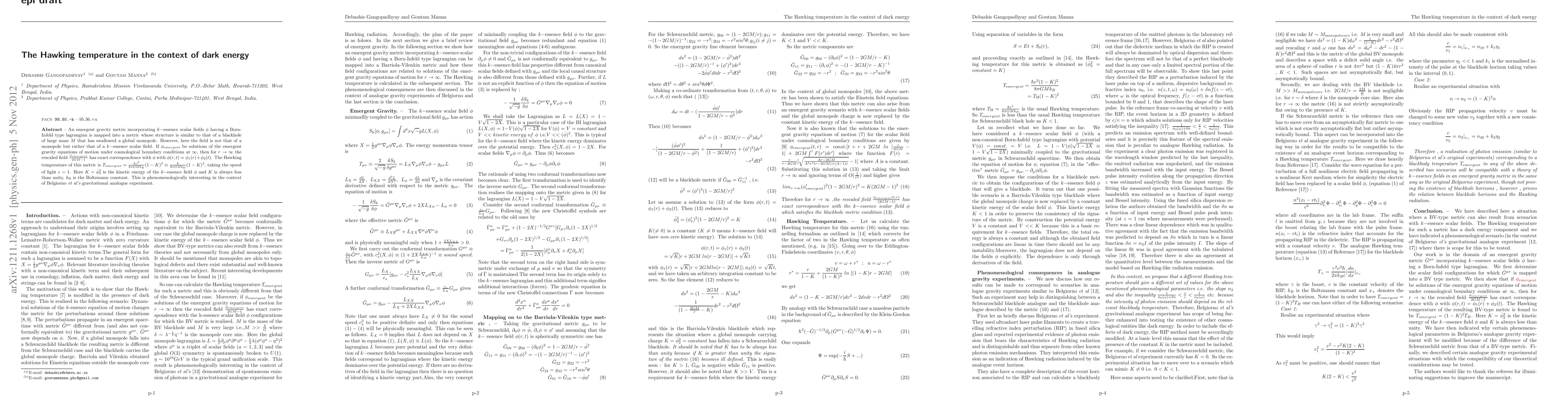 An emergent gravity metric incorporating $k-$essence scalar fields $\phi$ having a Born-Infeld type lagrangian is mapped into a metric whose structure is similar to that of a blackhole of large mass $M$ that has swallowed a global monopole. However, here the field is not that of a monopole but rather that of a $k-$essence scalar field. If $\phi_{emergent}$ be solutions of the emergent gravity equations of motion under cosmological boundary conditions at $\infty$, then for $r\rightarrow\infty$ the rescaled field $\frac {\phi_{emergent}}{2GM-1}$ has exact correspondence with $\phi$ with $\phi(r,t)=\phi_{1}(r)+\phi_{2}(t)$. The Hawking temperature of this metric is $T_{\mathrm emergent}= \frac{\hbar c^{3}}{8\pi GM k_{\mathrm B}}(1-K)^{2}\equiv \frac{\hbar}{8\pi GM k_{\mathrm B}}(1-K)^{2}$, taking the speed of light $c=1$. Here $K=\dot\phi_{2}^{2}$ is the kinetic energy of the $k-$essence field $\phi$ and $K$ is always less than unity, $k_{\mathrm B}$ is the Boltzmann constant. This is phenomenologically interesting in the context of Belgiorno {\it et al's} gravitational analogue experiment.