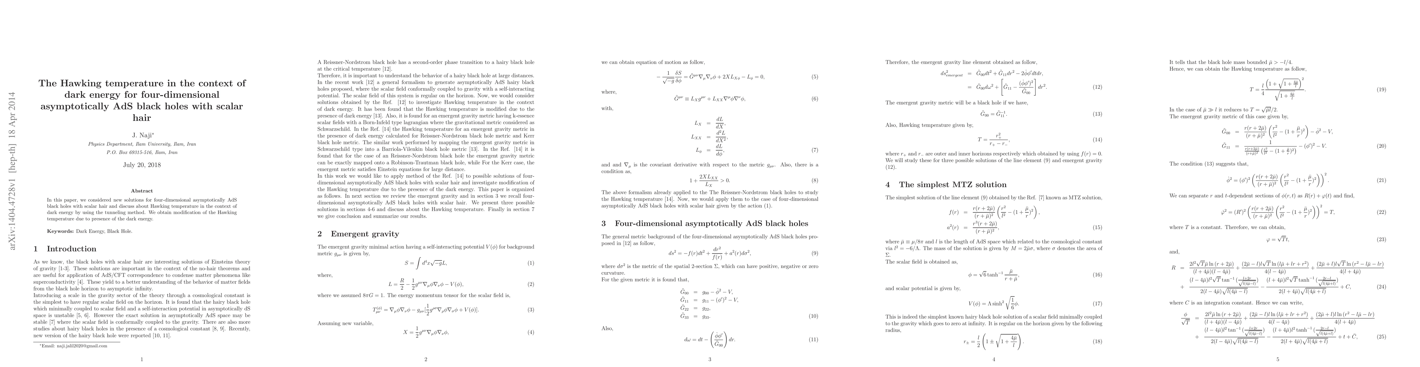 Summary: This paper explores new solutions for four-dimensional asymptotically AdS black holes with scalar hair, revealing modifications to the Hawking temperature influenced by the presence of dark energy through the tunneling method. The findings suggest a significant impact of dark energy on black hole thermodynamics.