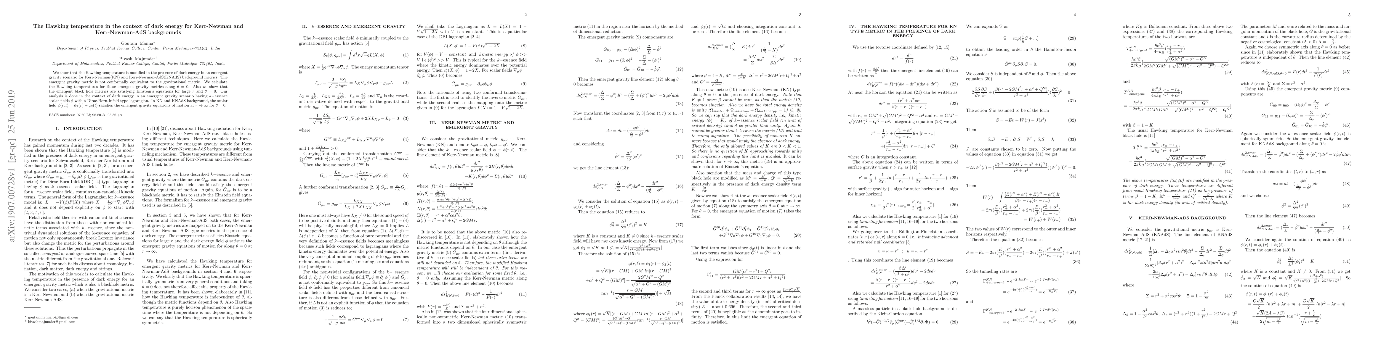 We show that the Hawking temperature is modified in the presence of dark energy in an emergent gravity scenario for Kerr-Newman(KN) and Kerr-Newman-AdS(KNAdS) background metrics. The emergent gravity metric is not conformally equivalent to the gravitational metric. We calculate the Hawking temperatures for these emergent gravity metrics along $\theta=0$. Also we show that the emergent black hole metrics are satisfying Einstein's equations for large $r$ and $\theta=0$. Our analysis is done in the context of dark energy in an emergent gravity scenario having $k-$essence scalar fields $\phi$ with a Dirac-Born-Infeld type lagrangian. In KN and KNAdS background, the scalar field $\phi(r,t)=\phi_{1}(r)+\phi_{2}(t)$ satisfies the emergent gravity equations of motion at $r\rightarrow\infty$ for $\theta=0$.