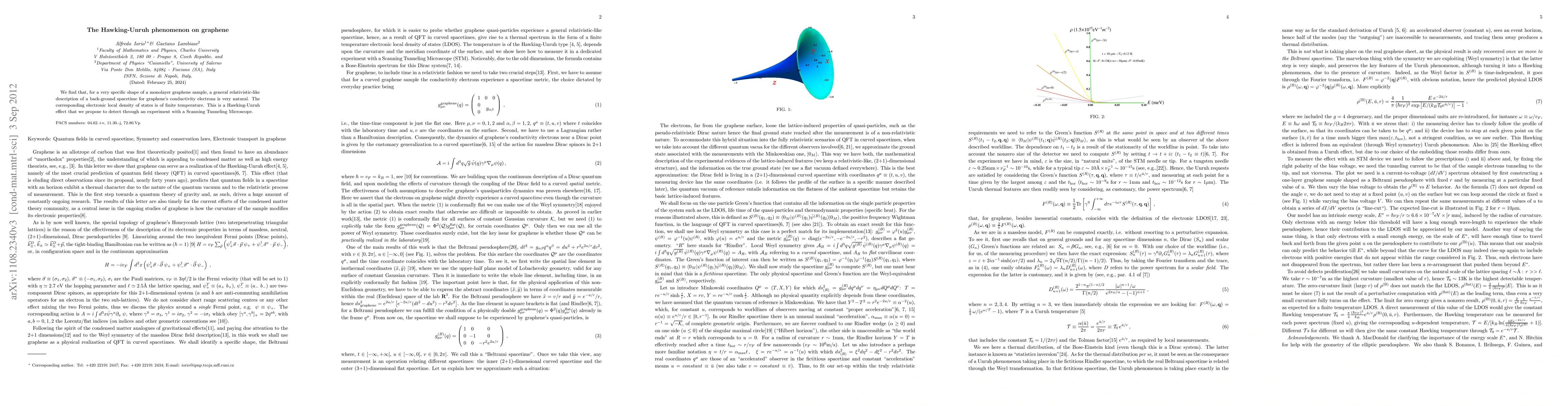 The research reveals that a specific graphene shape exhibits a Hawking-Unruh effect, where graphene's electrons behave as if in a thermal state due to a general relativistic background. The study proposes a Scanning Tunneling Microscope experiment to detect this phenomenon.