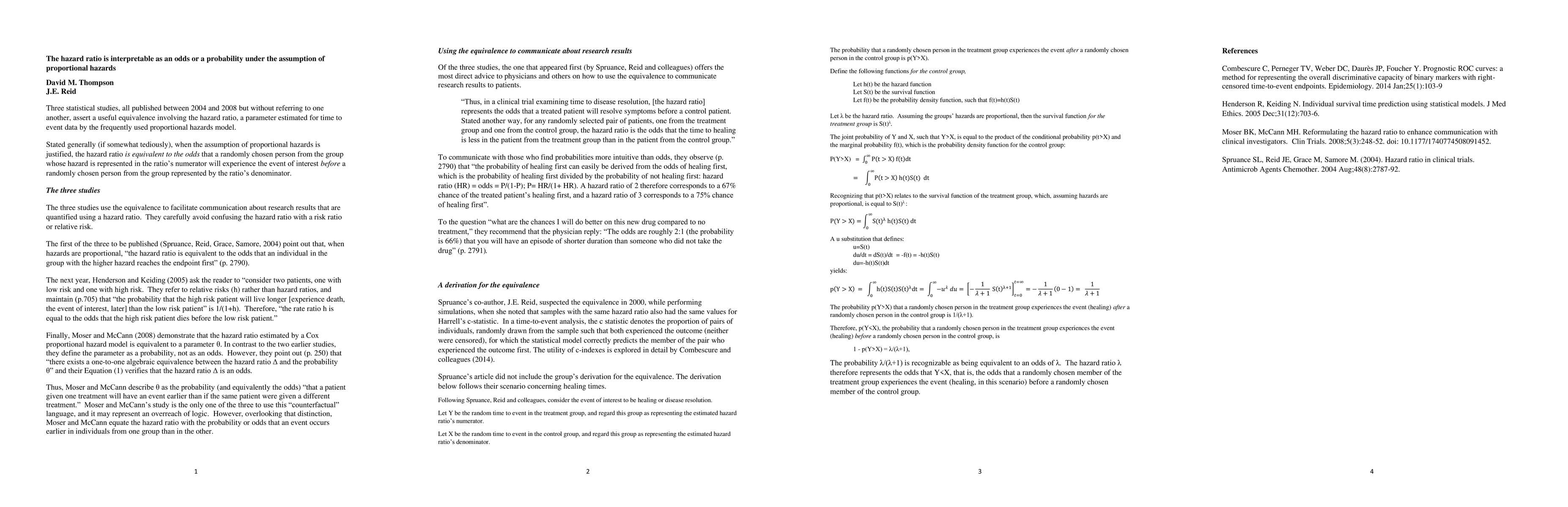 Three statistical studies, all published between 2004 and 2008 but without referring to one another, assert a useful equivalence involving the hazard ratio, a parameter estimated for time to event data by the frequently used proportional hazards model. Stated generally, when the assumption of proportional hazards is justified, the hazard ratio is equivalent to the odds that a randomly chosen person from the group whose hazard is represented in the ratio's numerator will experience the event of interest before a randomly chosen person from the group represented by the ratio's denominator.