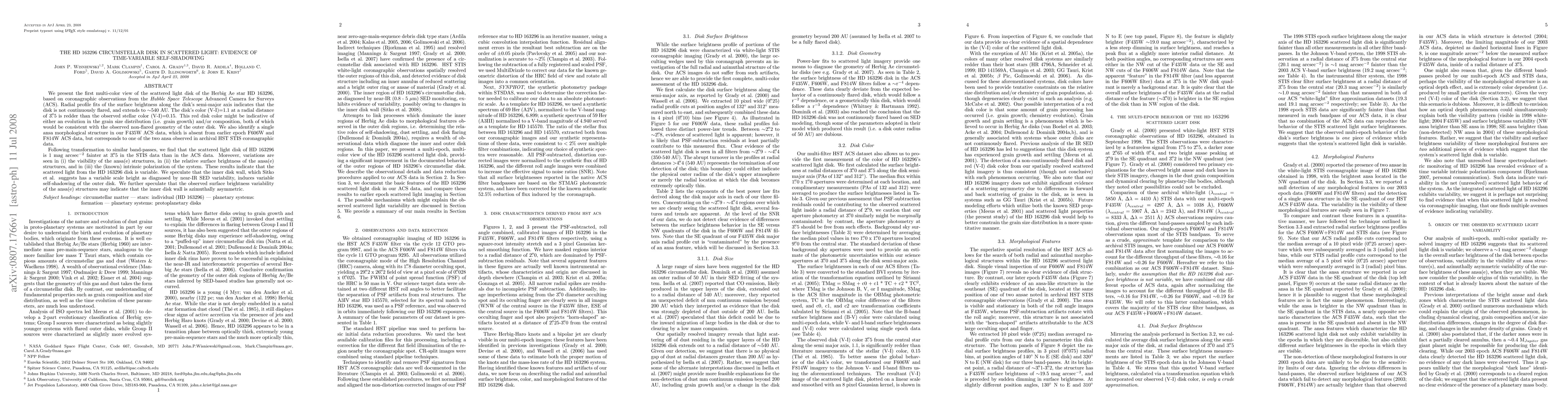 This study reveals the scattered light disk of HD 163296 using Hubble Space Telescope data, showing a non-flared disk extending to 540 AU with redder color than the star. Variations in the disk's brightness and ansa structures suggest time-variable self-shadowing likely caused by an asymmetric inner disk wall.