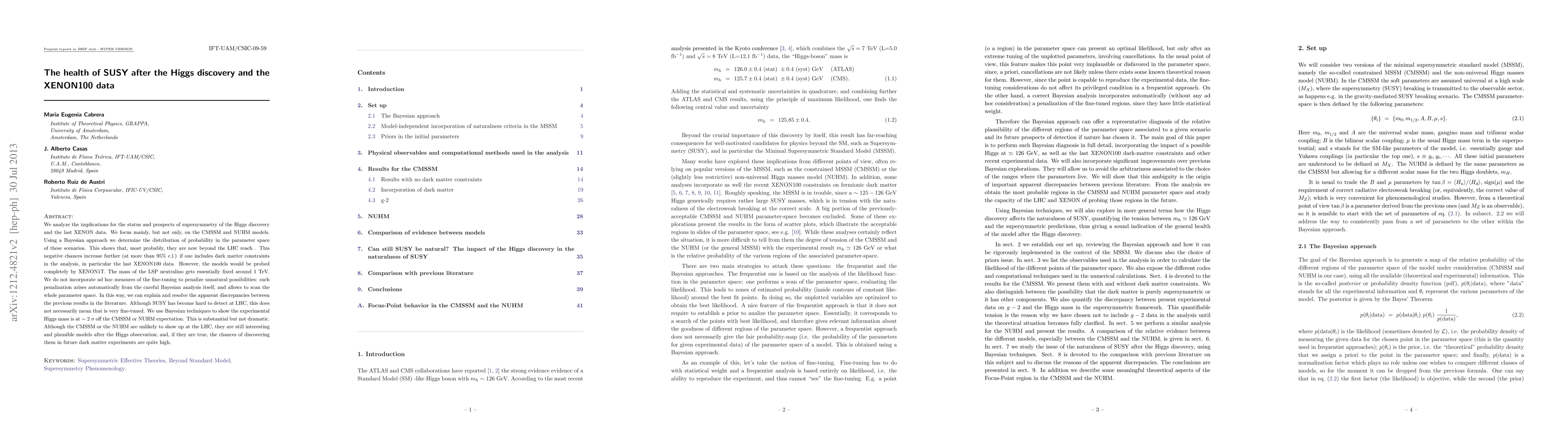 We analyze the implications for the status and prospects of supersymmetry of the Higgs discovery and the last XENON data. We focus mainly, but not only, on the CMSSM and NUHM models. Using a Bayesian approach we determine the distribution of probability in the parameter space of these scenarios. This shows that, most probably, they are now beyond the LHC reach . This negative chances increase further (at more than 95% c.l.) if one includes dark matter constraints in the analysis, in particular the last XENON100 data. However, the models would be probed completely by XENON1T. The mass of the LSP neutralino gets essentially fixed around 1 TeV. We do not incorporate ad hoc measures of the fine-tuning to penalize unnatural possibilities: such penalization arises automatically from the careful Bayesian analysis itself, and allows to scan the whole parameter space. In this way, we can explain and resolve the apparent discrepancies between the previous results in the literature. Although SUSY has become hard to detect at LHC, this does not necessarily mean that is very fine-tuned. We use Bayesian techniques to show the experimental Higgs mass is at $\sim 2\ \sigma$ off the CMSSM or NUHM expectation. This is substantial but not dramatic. Although the CMSSM or the NUHM are unlikely to show up at the LHC, they are still interesting and plausible models after the Higgs observation; and, if they are true, the chances of discovering them in future dark matter experiments are quite high.