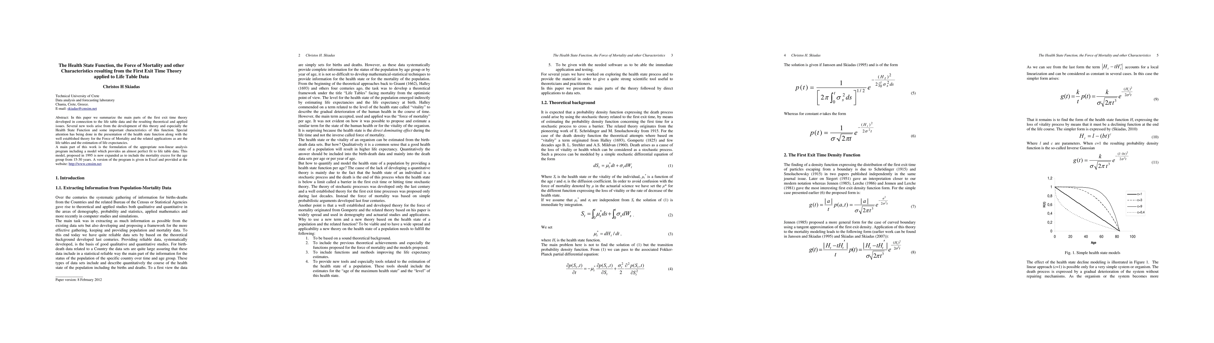 In this paper we summarize the main parts of the first exit time theory developed in connection to the life table data and the resulting theoretical and applied issues. Several new tools arise from the development of this theory and especially the Health State Function and some important characteristics of this function. Special attention has being done in the presentation of the health state function along with the well established theory for the Force of Mortality and the related applications as are the life tables and the estimation of life expectancies. A main part of this work is the formulation of the appropriate non-linear analysis program including a model which provides an almost perfect fit to life table data. This model, proposed in 1995 is now expanded as to include the mortality excess for the age group from 15-30 years. A version of the program is given in Excel and provided at the website: http://www.cmsim.net