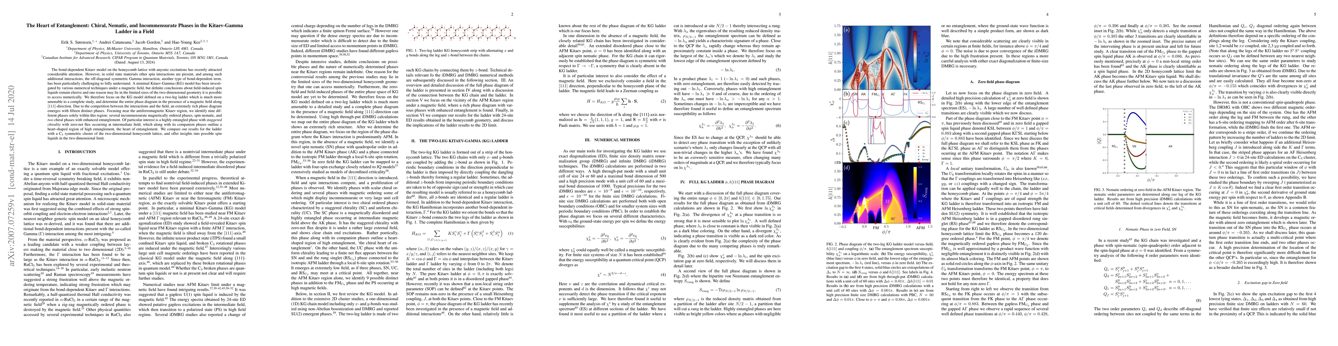 The bond-dependent Kitaev model on the honeycomb lattice with anyonic excitations has recently attracted considerable attention. However, in solid state materials other spin interactions are present, and among such additional interactions, the off-diagonal symmetric Gamma interaction, another type of bond-dependent term, has been particularly challenging to fully understand. A minimal Kitaev-Gamma (KG) model has been investigated by various numerical techniques under a magnetic field, but definite conclusions about field-induced spin liquids remain elusive and one reason may lie in the limited sizes of the two-dimensional geometry it is possible to access numerically. We therefore focus on the KG model defined on a two-leg ladder which is much more amenable to a complete study, and determine the entire phase diagram in the presence of a magnetic field along [111]-direction. Due to the competition between the interactions and the field, an extremely rich phase diagram emerges with fifteen distinct phases. Focusing near the antiferromagnetic Kitaev region, we identify nine different phases solely within this region: several incommensurate magnetically ordered phases, spin nematic, and two chiral phases with enhanced entanglement. Of particular interest is a highly entangled phase with staggered chirality with zero-net flux occurring at intermediate field, which along with its companion phases outline a heart-shaped region of high entanglement, the heart of entanglement. We compare our results for the ladder with a C3 symmetric cluster of the two-dimensional honeycomb lattice, and offer insights into possible spin liquids in the two-dimensional limit.