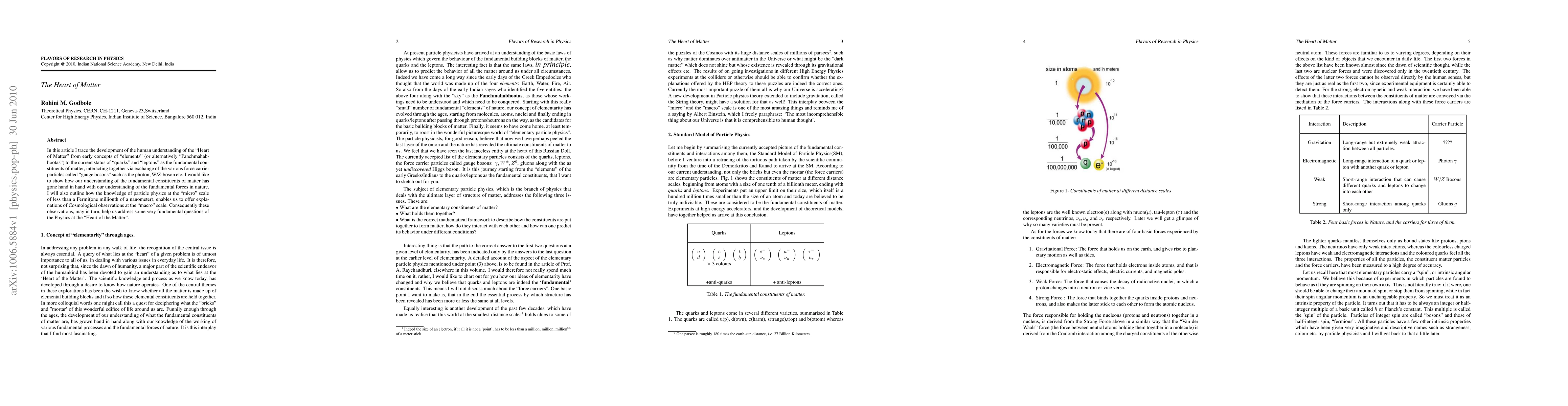 In this article I trace the development of the human understanding of the "Heart of Matter" from early concepts of "elements" (or alternatively "Panchmahabhootas") to the current status of "quarks" and "leptons" as the fundamental constituents of matter, interacting together via exchange of the various force carrier particles called "gauge bosons" such as the photon, W/Z-boson etc. I would like to show how our understanding of the fundamental constituents of matter has gone hand in hand with our understanding of the fundamental forces in nature. I will also outline how the knowledge of particle physics at the "micro" scale of less than a Fermi(one millionth of a nanometer), enables us to offer explanations of Cosmological observations at the "macro" scale. Consequently these observations, may in turn, help us address some very fundamental questions of the Physics at the "Heart of the Matter".