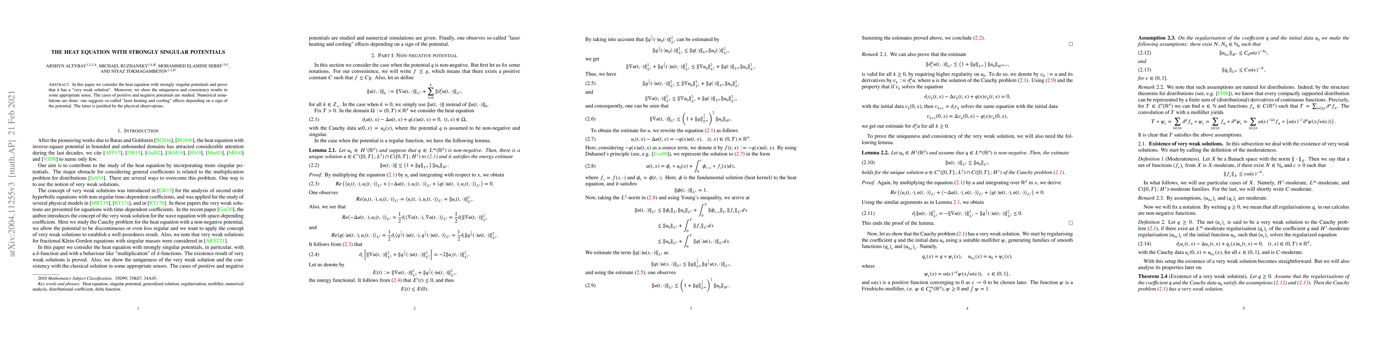 In this paper, we consider the heat equation with strongly singular potentials and prove that it has a "very weak solution". Moreover, we show the uniqueness and consistency results in some appropriate sense. The cases of positive and negative potentials are studied. Numerical simulations are done: one suggests so-called "laser heating and cooling" effects depending on a sign of the potential. The latter is justified by physical observations.