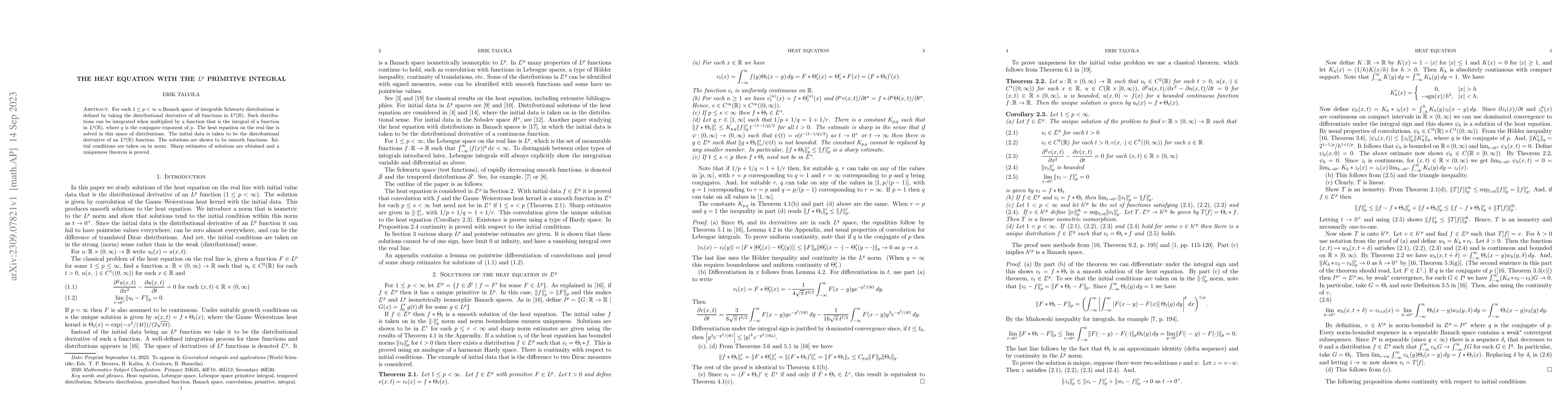 For each $1\leq p<\infty$ a Banach space of integrable Schwartz distributions is defined by taking the distributional derivative of all functions in $L^p({\mathbb R})$. Such distributions can be integrated when multiplied by a function that is the integral of a function in $L^q({\mathbb R})$, where $q$ is the conjugate exponent of $p$. The heat equation on the real line is solved in this space of distributions. The initial data is taken to be the distributional derivative of an $L^p({\mathbb R})$ function. The solutions are shown to be smooth functions. Initial conditions are taken on in norm. Sharp estimates of solutions are obtained and a uniqueness theorem is proved.
