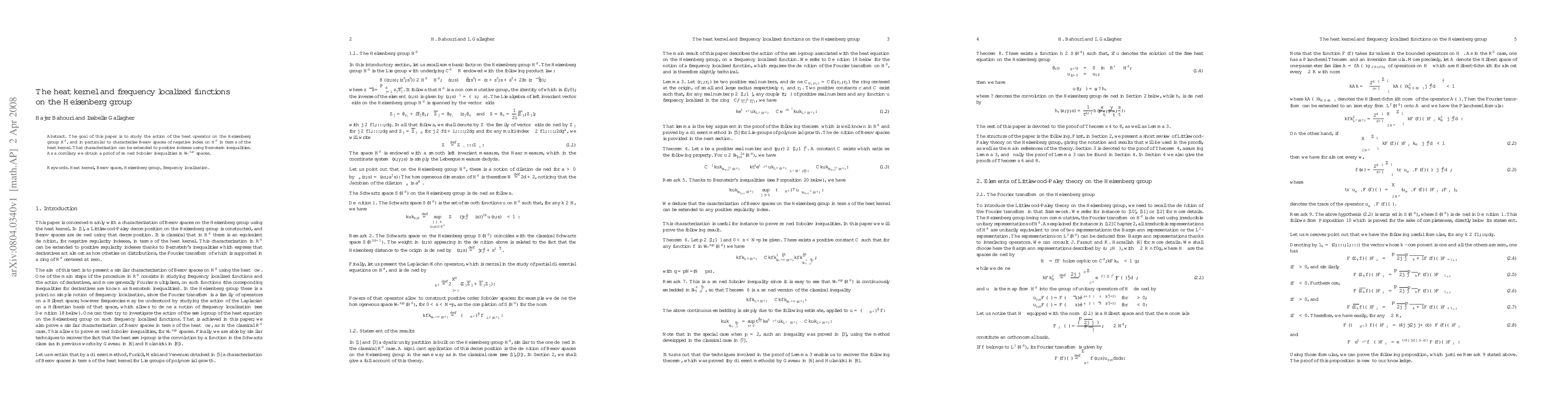 The goal of this paper is to study the action of the heat operator on the Heisenberg group H^d, and in particular to characterize Besov spaces of negative index on H^d in terms of the heat kernel. That characterization can be extended to positive indexes using Bernstein inequalities. As a corollary we obtain a proof of refined Sobolev inequalities in W^{s,p} spaces.
