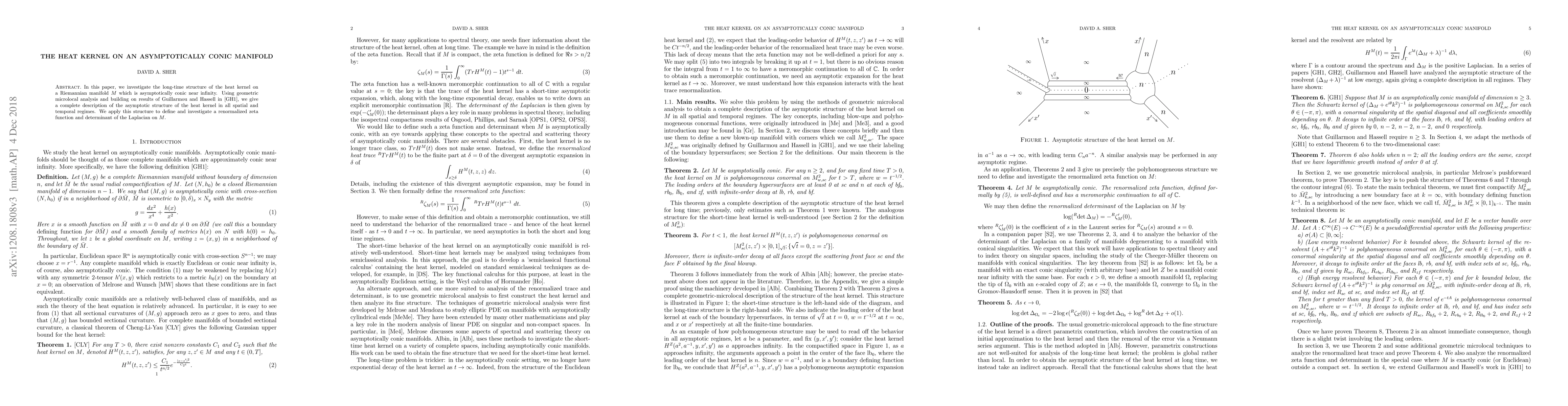 This paper explores the long-time behavior of the heat kernel on asymptotically conic Riemannian manifolds, providing a complete asymptotic description using geometric microlocal analysis. It applies this to define and study a renormalized zeta function and determinant of the Laplacian.