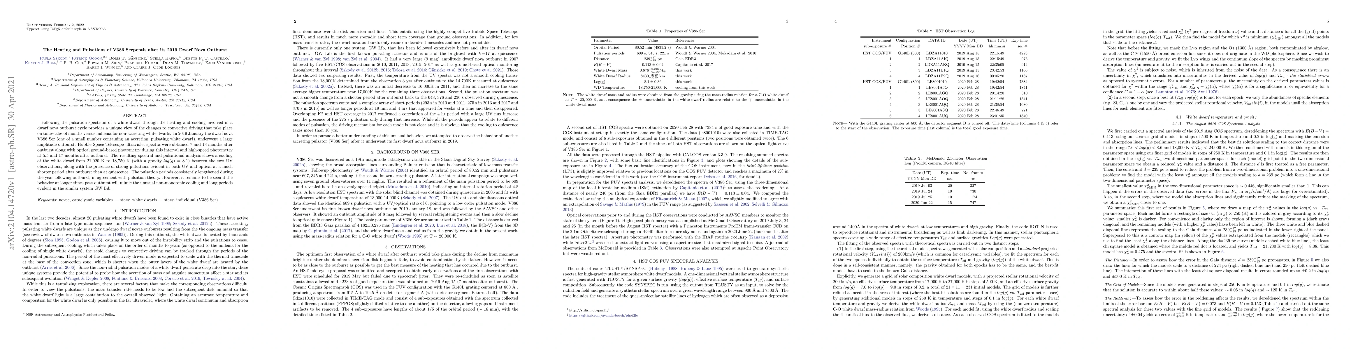 Following the pulsation spectrum of a white dwarf through the heating and cooling involved in a dwarf nova outburst cycle provides a unique view of the changes to convective driving that take place on timescales of months versus millenia for non-accreting white dwarfs. In 2019 January the dwarf nova V386 Ser (one of a small number containing an accreting, pulsating white dwarf), underwent a large amplitude outburst. Hubble Space Telescope ultraviolet spectra were obtained 7 and 13 months after outburst along with optical ground-based photometry during this interval and high-speed photometry at 5.5 and 17 months after outburst. The resulting spectral and pulsational analysis shows a cooling of the white dwarf from 21,020 K to 18,750 K (with a gravity log(g) = 8.1) between the two UV observations, along with the presence of strong pulsations evident in both UV and optical at a much shorter period after outburst than at quiescence. The pulsation periods consistently lengthened during the year following outburst, in agreement with pulsation theory. However, it remains to be seen if the behavior at longer times past outburst will mimic the unusual non-monotonic cooling and long periods evident in the similar system GW Lib.