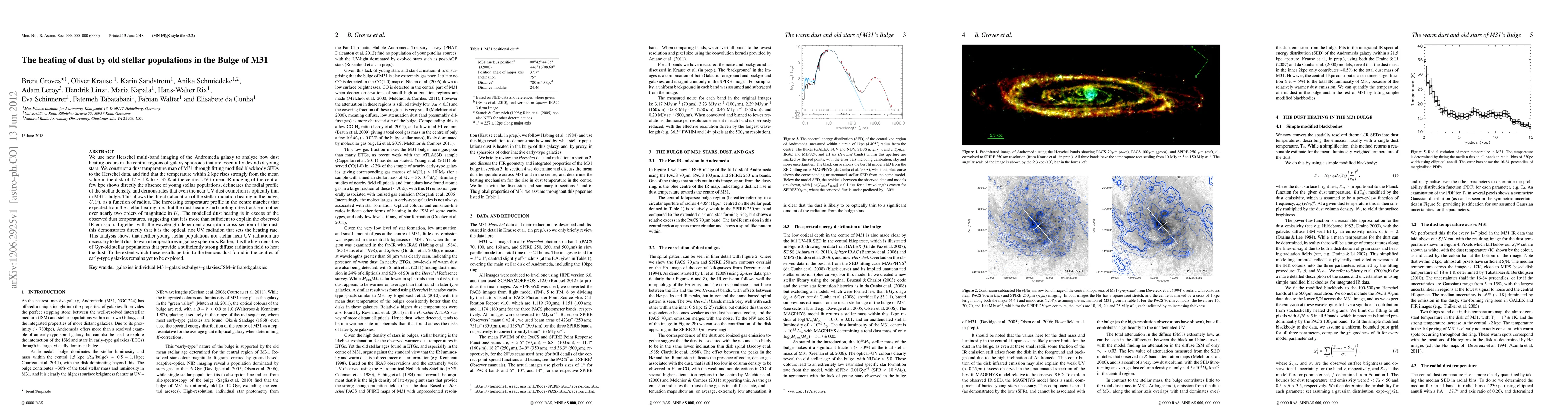 We use new Herschel multi-band imaging of the Andromeda galaxy to analyze how dust heating occurs in the central regions of galaxy spheroids that are essentially devoid of young stars. We construct a dust temperature map of M31 through fitting modified blackbody SEDs to the Herschel data, and find that the temperature within 2 kpc rises strongly from the mean value in the disk of 17 pm 1K to \sim35K at the centre. UV to near-IR imaging of the central few kpc shows directly the absence of young stellar populations, delineates the radial profile of the stellar density, and demonstrates that even the near-UV dust extinction is optically thin in M31's bulge. This allows the direct calculation of the stellar radiation heating in the bulge, U\ast(r), as a function of radius. The increasing temperature profile in the centre matches that expected from the stellar heating, i.e. that the dust heating and cooling rates track each other over nearly two orders of magnitude in U\ast. The modelled dust heating is in excess of the observed dust temperatures, suggesting that it is more than sufficient to explain the observed IR emission. Together with the wavelength dependent absorption cross section of the dust, this demonstrates directly that it is the optical, not UV, radiation that sets the heating rate. This analysis shows that neither young stellar populations nor stellar near-UV radiation are necessary to heat dust to warm temperatures in galaxy spheroids. Rather, it is the high densities of Gyr-old stellar populations that provide a sufficiently strong diffuse radiation field to heat the dust. To the extent which these results pertain to the tenuous dust found in the centres of early-type galaxies remains yet to be explored.