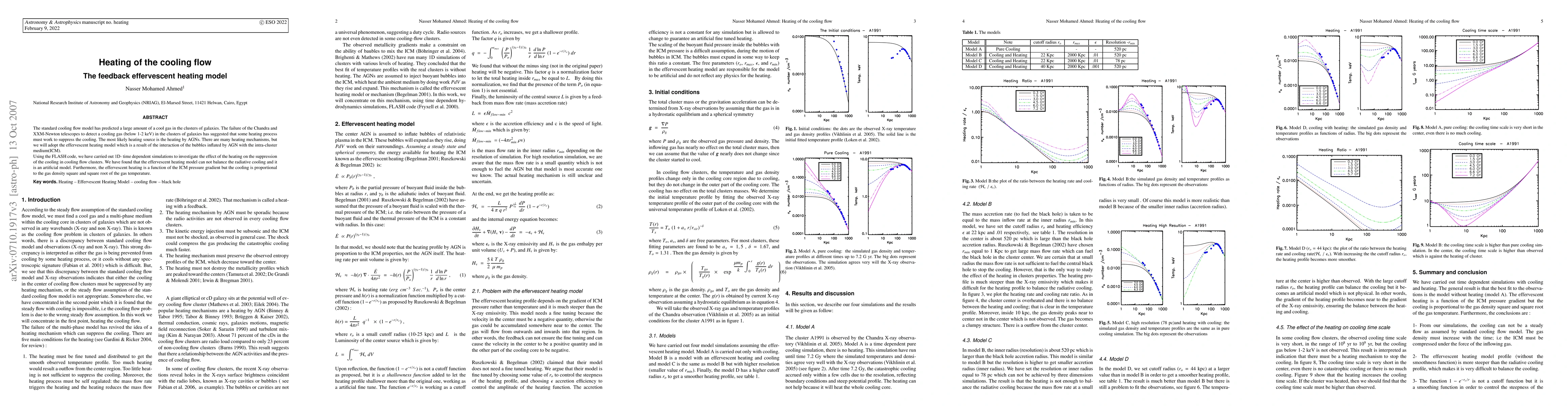 The standard cooling flow model has predicted a large amount of cool gas in the clusters of galaxies. The failure of the Chandra and XXM-Newton telescopes to detect cooling gas (below 1-2 keV) in clusters of galaxies has suggested that some heating process must work to suppress the cooling. The most likely heating source is the heating by AGNs. There are many heating mechanisms, but we will adopt the effervescent heating model which is a result of the interaction of the bubbles inflated by AGN with the intra-cluster medium(ICM). Using the FLASH code, we have carried out time dependent simulations to investigate the effect of the heating on the suppression of the cooling in cooling flow clusters. We have found that the effervescent heating model can not balance the radiative cooling and it is an artificial model. Furthermore, the effervescent heating is a function of the ICM pressure gradient but the cooling is proportional to the gas density square and square root of the gas temperature.