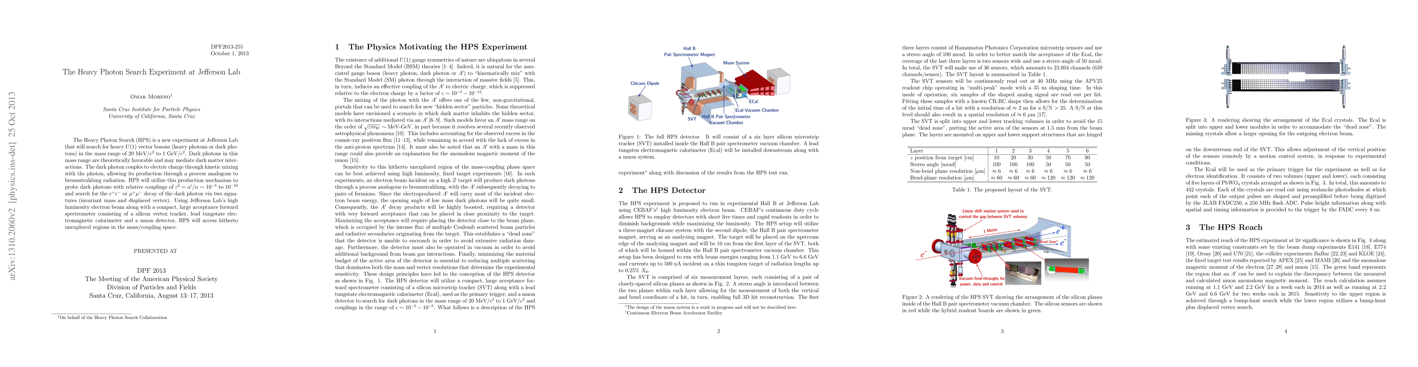 The Heavy Photon Search (HPS) experiment at Jefferson Lab aims to detect heavy U(1) vector bosons, or dark photons, in the mass range of 20 MeV/c² to 1 GeV/c², potentially mediating dark matter interactions. It will explore coupling strengths down to 10⁻¹⁰ using a high luminosity electron beam and advanced detection apparatus.